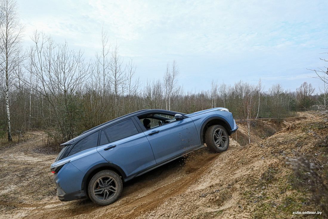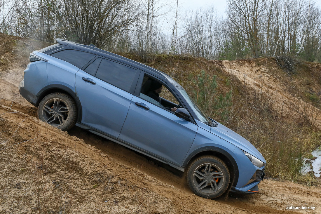 Переезжаем на другое место и находим подходящие неровности, чтобы сымитировать диагональное вывешивание. Вздернутое вверх заднее колесо выглядит эффектно, но у нас же только передний привод — так что куда важнее то, что одно из ведущих колес также оказалось разгружено и просто буксует. Назад автомобиль скатывается, а вот вперед ехать не хочет.