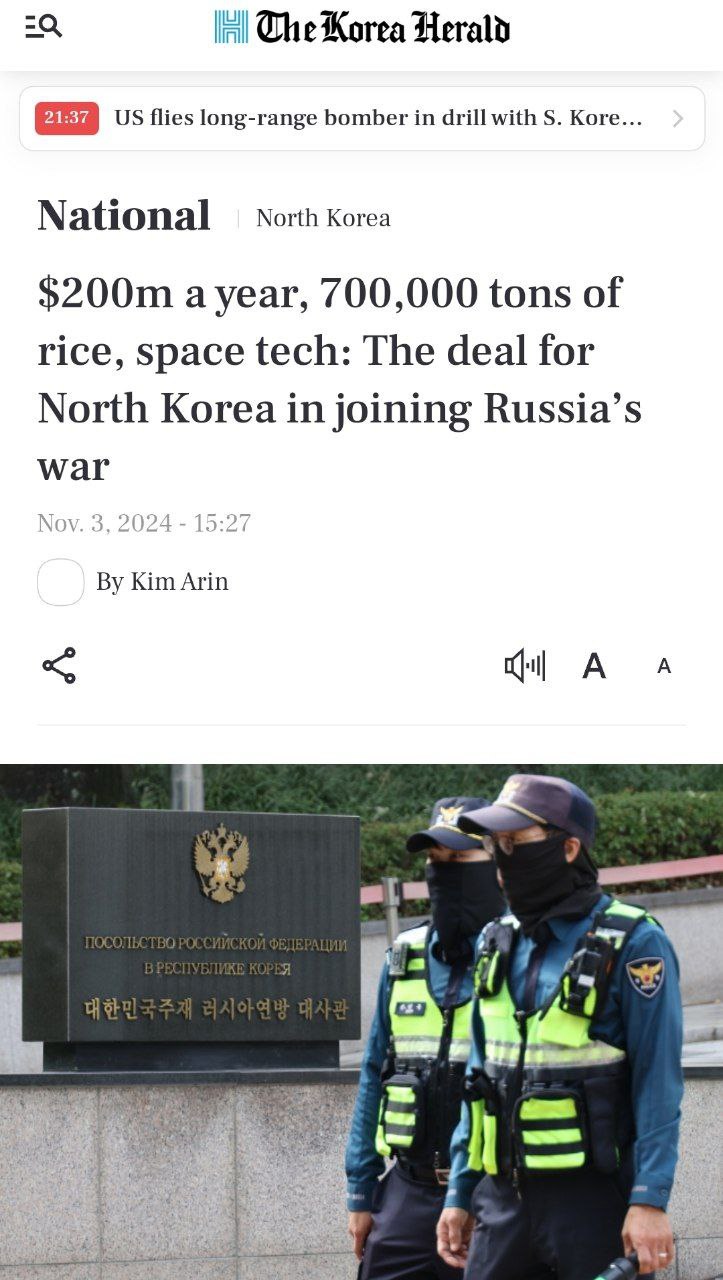 Согласно статье, КНДР также запросила у России ежегодные поставки 700 тонн риса, зарплату для своих военных, участвующих в боях в Украине, в размере $2 тысяч, и доступ к передовым космическим технологиям.