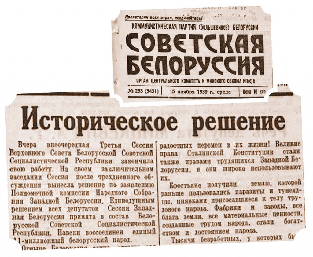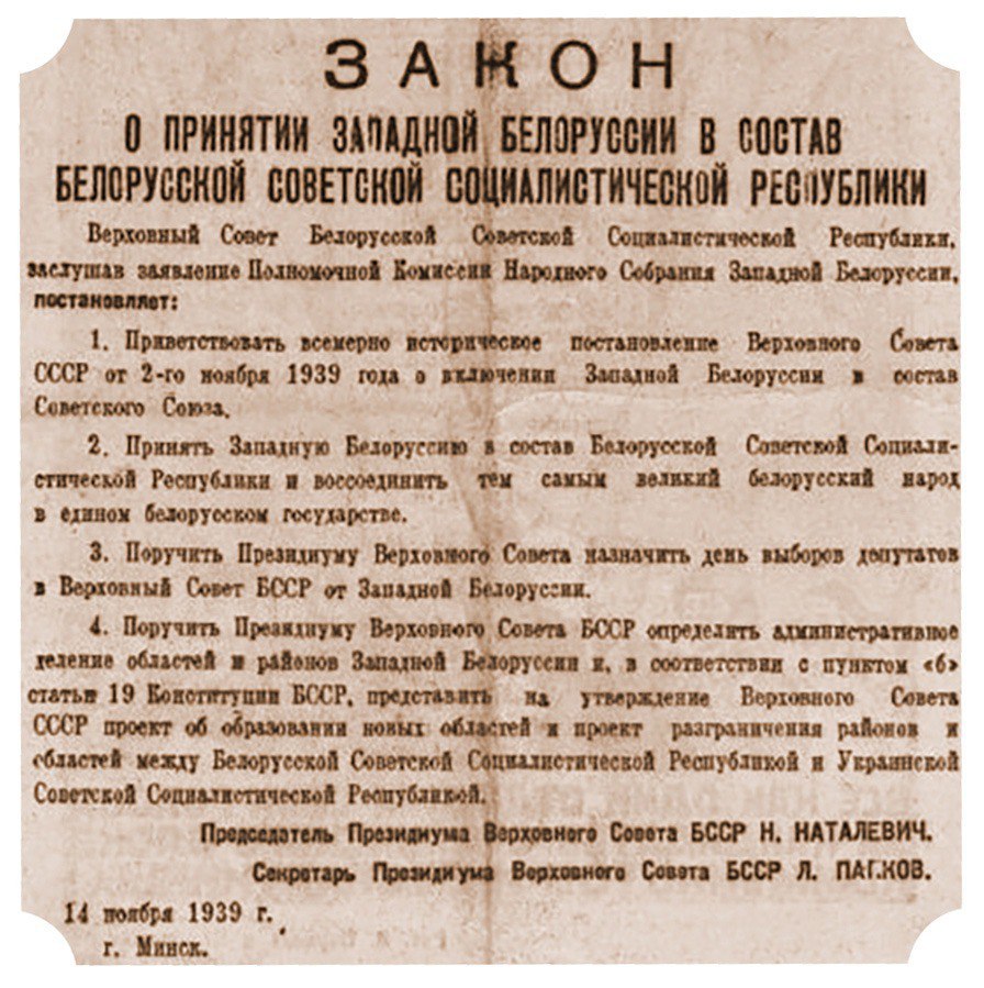 14 ноября 1939 года Верховный Совет БССР официально постановил принять Закон о включении Западной Беларуси в состав Республики.