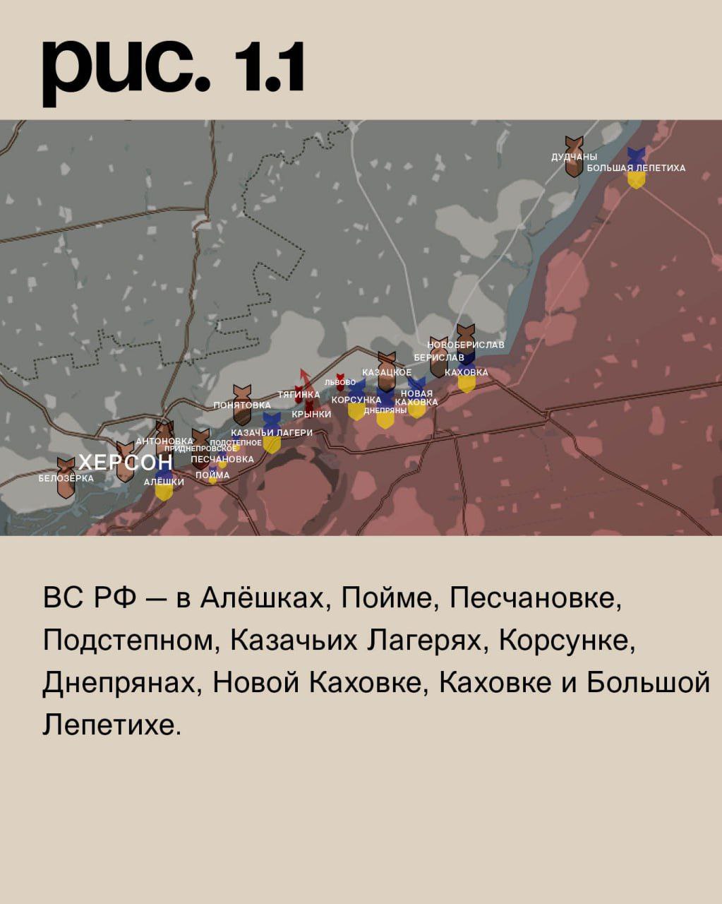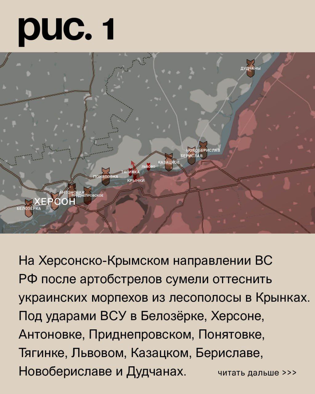 На Херсонско-Крымском направлении ВС РФ после артобстрелов сумели оттеснить украинских морпехов из лесополосы в Крынках. Под ударами ВСУ в Белозёрке, Херсоне, Антоновке, Приднепровском, Понятовке, Тягинке, Львовом, Казацком, Бериславе, Новобериславе и Дудчанах. ВС РФ – в Алёшках, Пойме, Песчановке, Подстепном, Казачьих Лагерях, Корсунке, Днепрянах, Новой Каховке, Каховке и Большой Лепетихе. (Рис. 1)