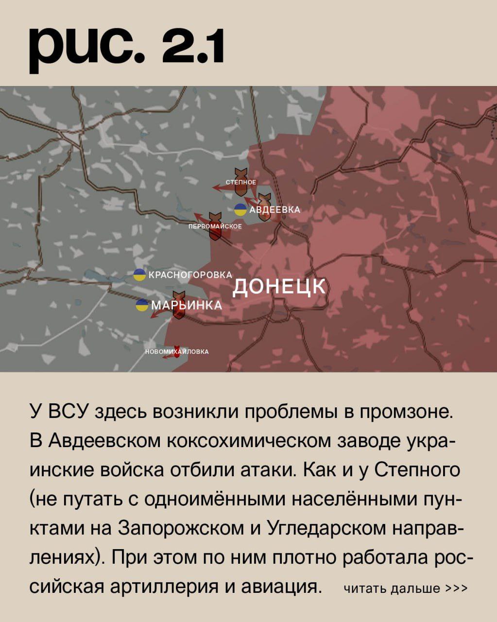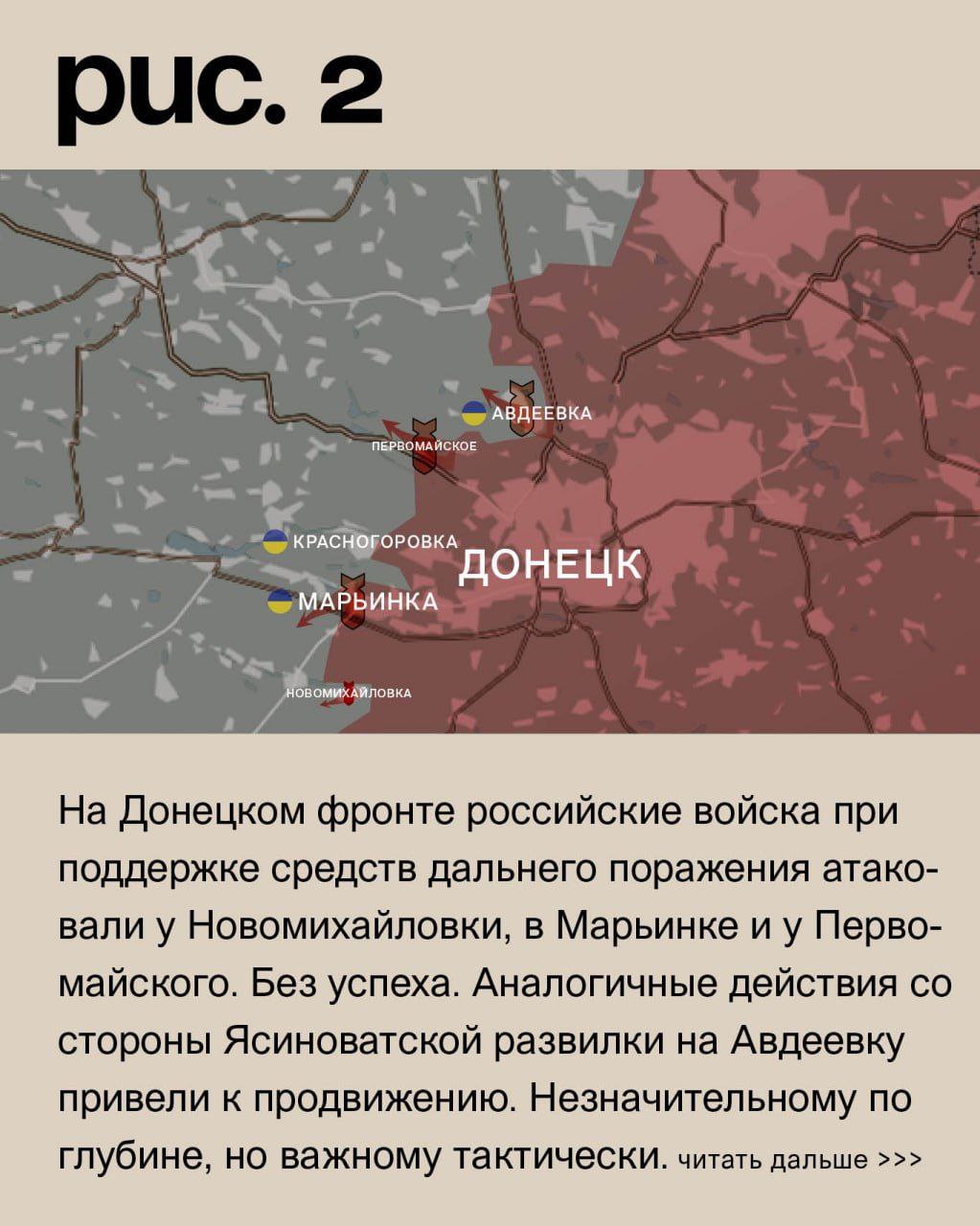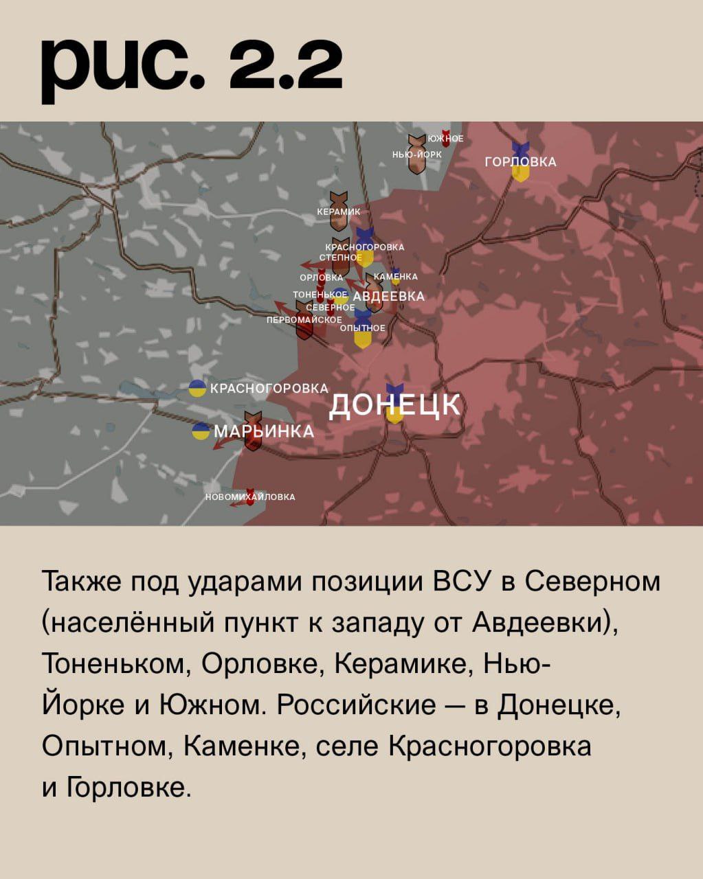 На Донецком фронте российские войска при поддержке средств дальнего поражения атаковали у Новомихайловки, в Марьинке и у Первомайского. Без успеха. Аналогичные действия со стороны Ясиноватской развилки на Авдеевку привели к продвижению. Незначительному по глубине, но важному тактически. У ВСУ здесь возникли проблемы в промзоне. В Авдеевском коксохимическом заводе украинские войска отбили атаки. Как и у Степного (не путать с одноимёнными населёнными пунктами на Запорожском и Угледарском направлениях). При этом по ним плотно работала российская артиллерия и авиация. Также под ударами позиции ВСУ в Северном (населённый пункт к западу от Авдеевки), Тоненьком, Орловке, Керамике, Нью-Йорке и Южном. Российские – в Донецке, Опытном, Каменке, селе Красногоровка и Горловке. (Рис. 2)