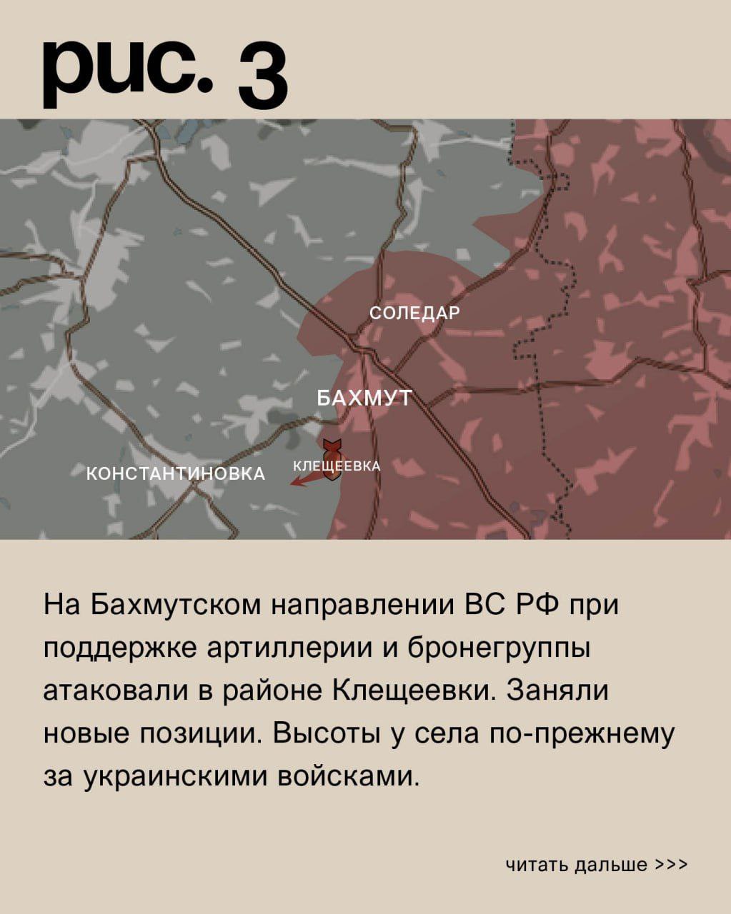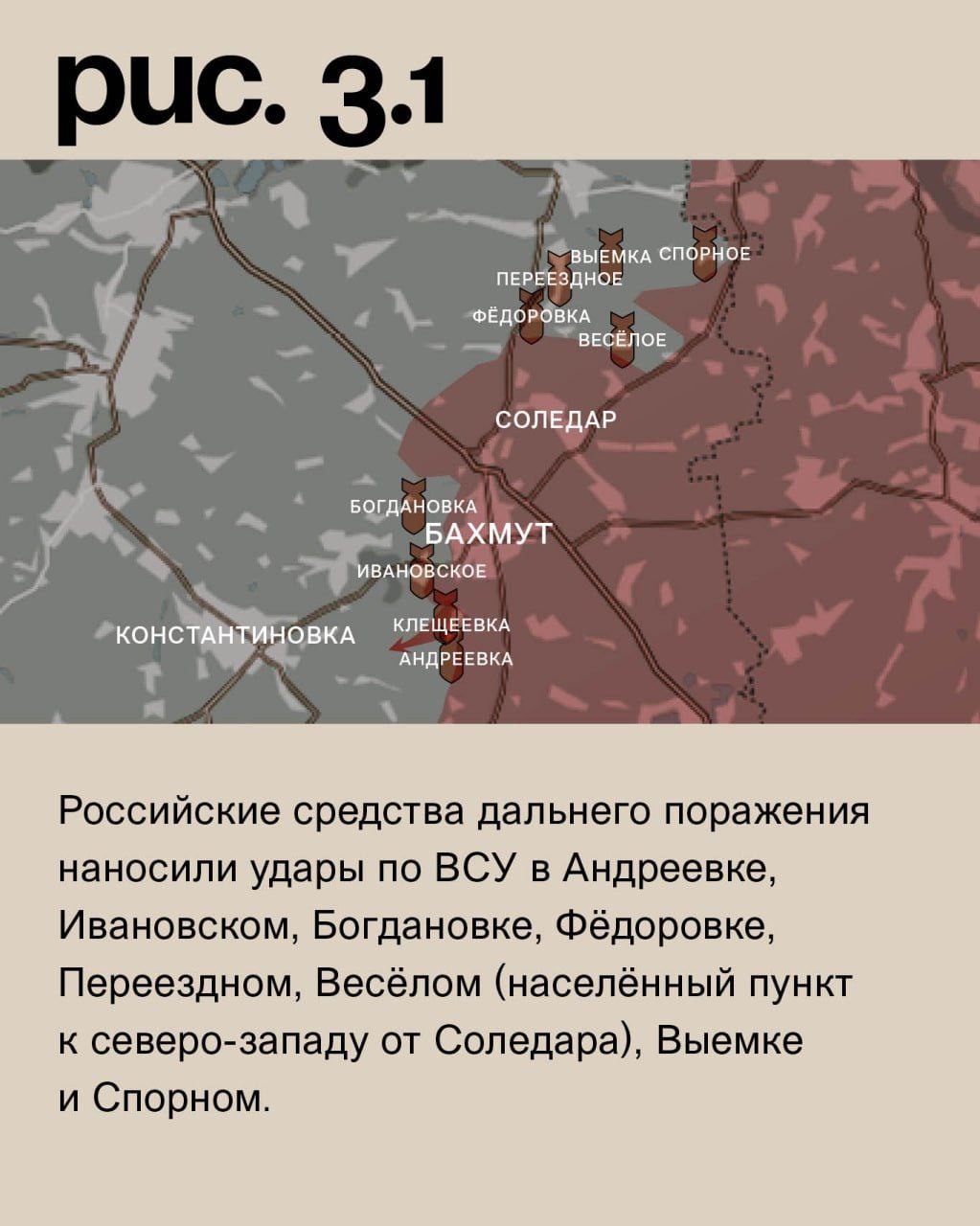 На Бахмутском направлении ВС РФ при поддержке артиллерии и бронегруппы атаковали в районе Клещеевки. Заняли новые позиции. Высоты у села по-прежнему за украинскими войсками. Российские средства дальнего поражения наносили удары по ВСУ в Андреевке, Ивановском, Богдановке, Фёдоровке, Переездном, Весёлом (населённый пункт к северо-западу от Соледара), Выемке и Спорном. (Рис. 3)