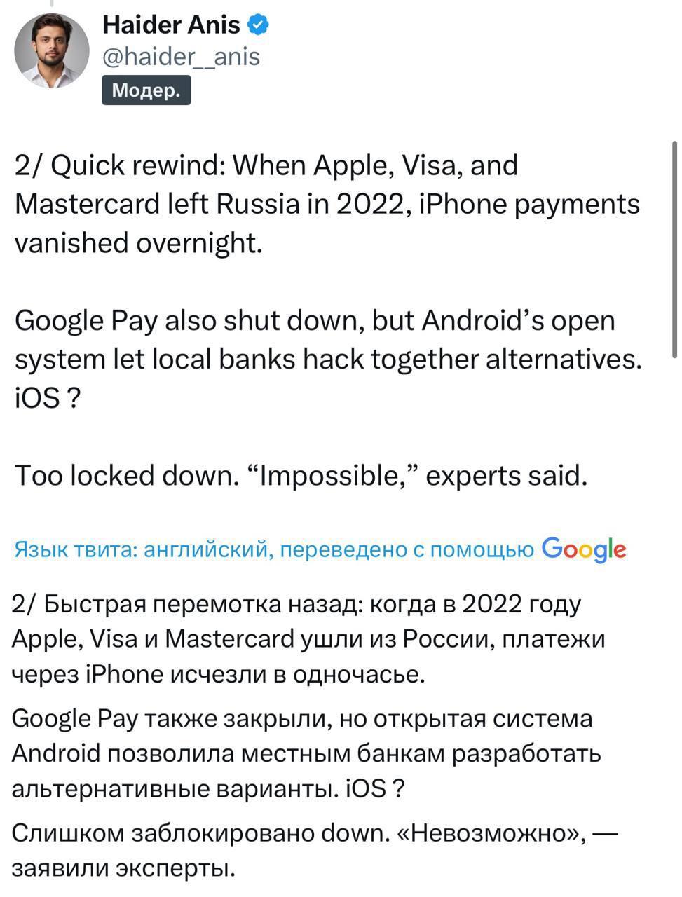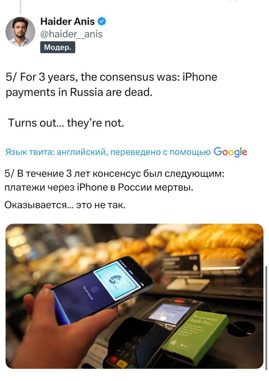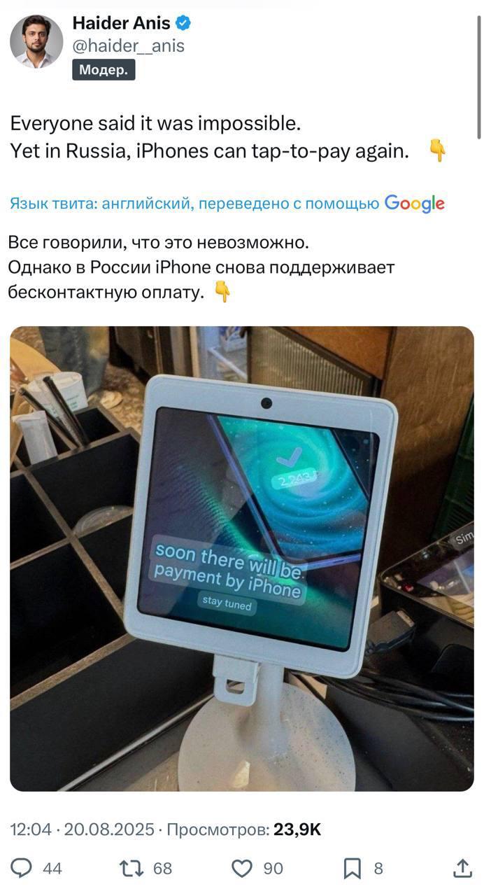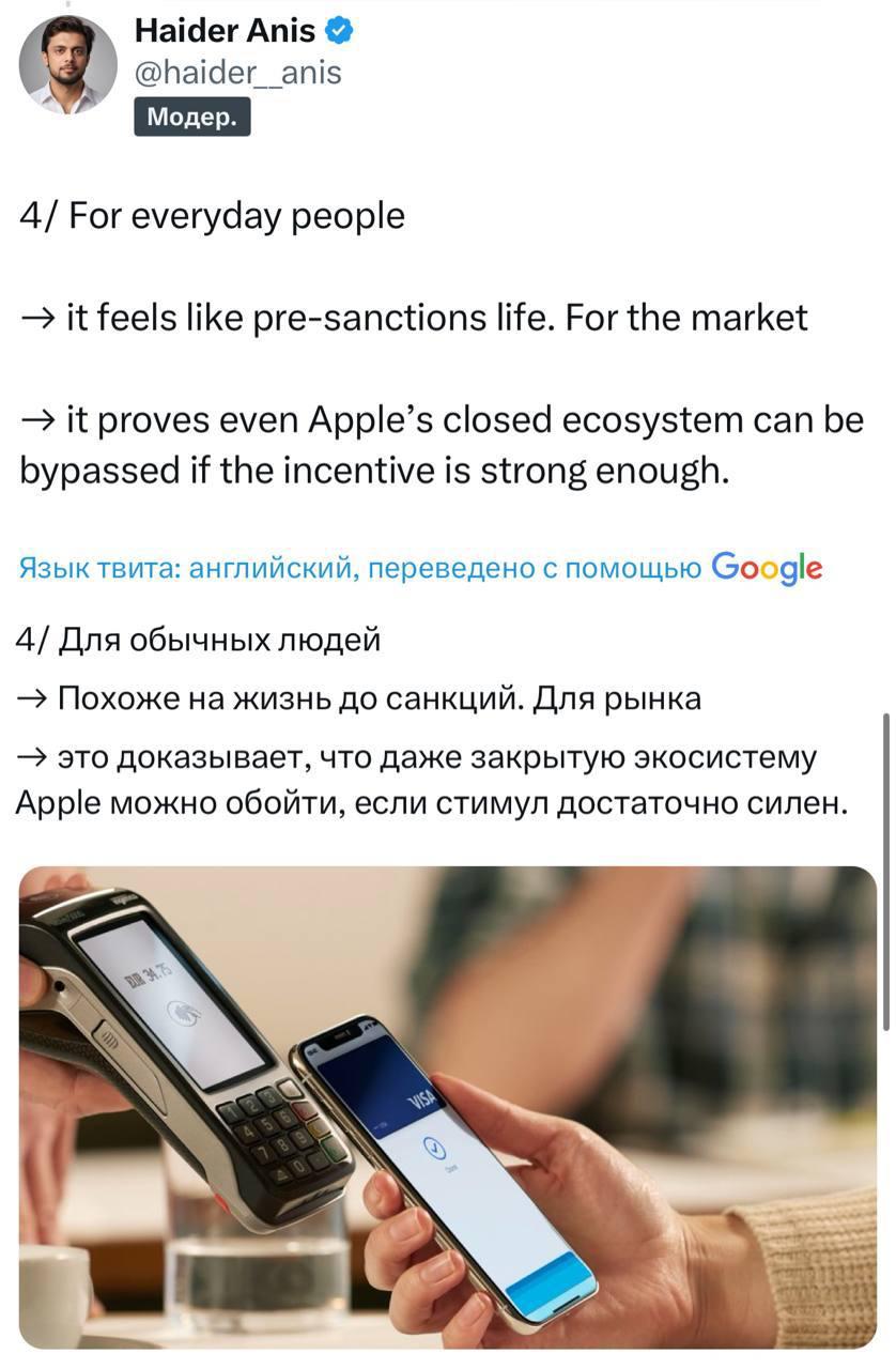 "Все говорили, что это невозможно": зарубежный блогер в соцсети X рассказал, что в России запускают сервис, который заменит ушедший из страны Apple Pay, аналог которого разработали в Сбере. Автор поста обратил внимание на то, что это было сделано без "бесконечных обещаний" и "половинчатых решений". В результате собственная технология будет работать на терминалах банка, словно в досанкционные времена. @banksta