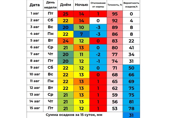За первые 15 дней месяца ожидается выпадение до 31 мм осадков, что соответствует норме.Предварительный прогноз на вторую половину месяца также благоприятный. Дневные температуры составят +19…+23 градуса, ночные – +9…+13 градусов. Метеорологи не ожидают сильной и продолжительной жары.
