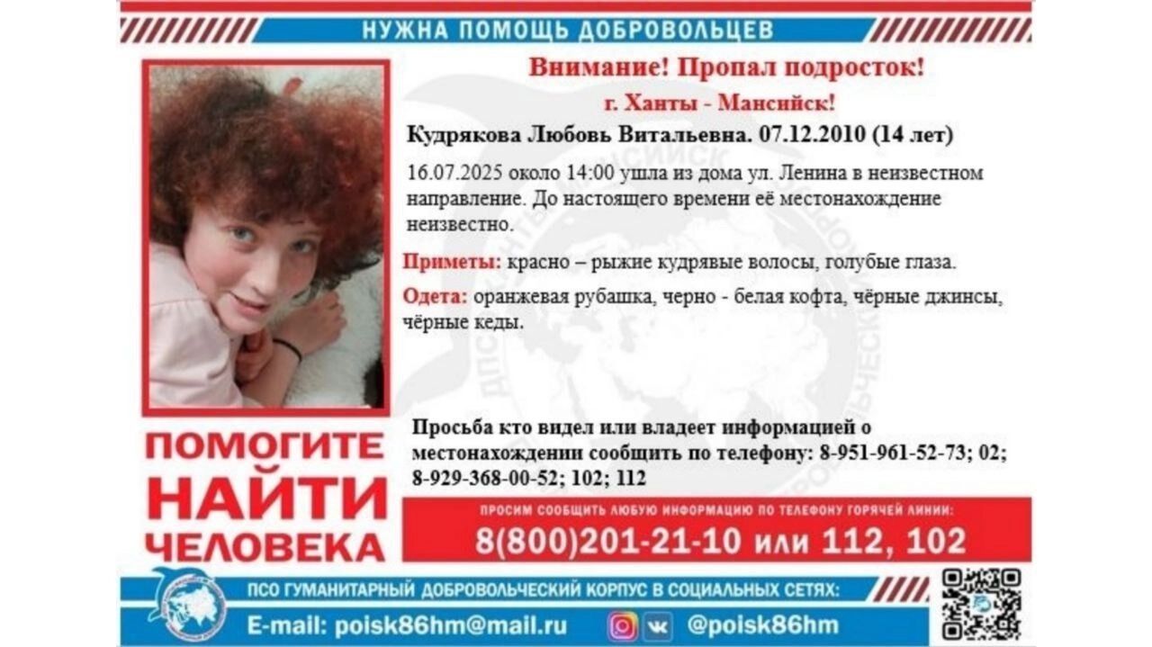 Одна из пропавших — из Ханты-Мансийска. 14-летняя девочка ушла из дома по улице Ленина около 14:00 в среду, 16 июля. С тех пор ее местонахождение неизвестно. У ребенка красно-рыжие кудрявые волосы и голубые глаза. Девочка была одета в оранжевую рубашку, черно-белую кофту, черные джинсы и черные кеды.
