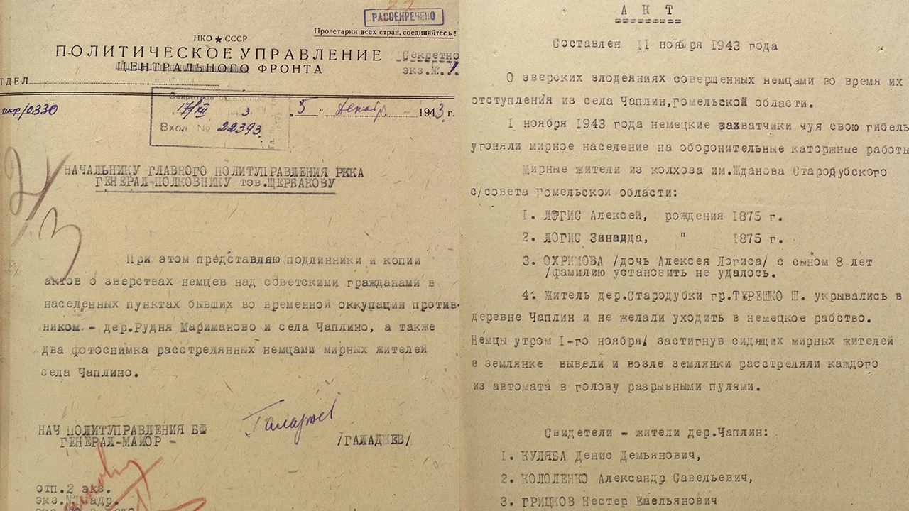 В феврале 1944 года в результате расследования, которое было проведено в Гомельской области, в частности в Рогачевском районе, удалось установить многочисленные факты немецких злодеяний. Некоторые из них приведены в опубликованной докладной записке военного прокурора 8-й армии. В документе указано, что оккупанты регулярно проводили массовые расстрелы гражданских лиц, причем убивали мирных жителей с особой жестокостью.