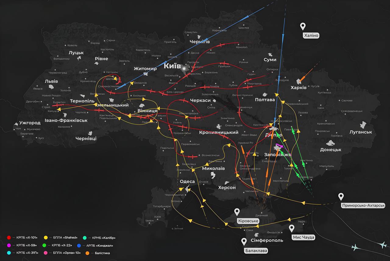 ⚡️🇷🇺🇺🇦Массированная комбинированная атака ВС РФ Вторую ночь подряд российскими войсками наносятся комплексные удары по территории Украины. Сегодня целями поражения стали военно-промышленный комплекс, центры подготовки и постоянной дислокации личного состава противника, но основной удар был нанесен по энергетической инфраструктуре Украины, которая подверглась массированной атаке впервые с марта 2023 года. Целями стали как крупные электростанции, так и подстанции по всей стране. 🔻Хронология событий: ▪️Около полуночи были совершены пуски ударных БЛА "Герань-2", которые примерно в 2:00 начали налёты на цели в различных регионах Украины. 📌Интересно отметить, что на этот раз "Герани" значительно быстрее оказались в западных регионах Украины. Это может свидетельствовать о возможном использовании нового типа барражирующих боеприпасов с реактивным двигателем. ▪️Параллельно с этим оперативно-тактическая авиация совершала пуски ракет Х-59. ▪️Спустя два часа к атаке присоединились около двенадцати ракетоносцев Ту-95МС, которые совершили массированный удар по территории Украины при помощи крылатых ракет Х-101/Х-555. ▪️С целью окончательного истощения средств ПВО противника, регулярно совершались пуски баллистических ракет ОТРК "Искандер-М" и ЗРК С-400. ▪️Не обошлось и без МиГ-31К, которыми были совершены пуски гиперзвуковых ракет "Кинжал". 🔻Всего в атаке было задействовано свыше 90 различных ракет и не менее 65 ударных БЛА "Герань-2". Ваш, ПартиꙂан! *карта маршрутов полета поражающих средств, использованная в публикации, взята с украинского новостного сегмента