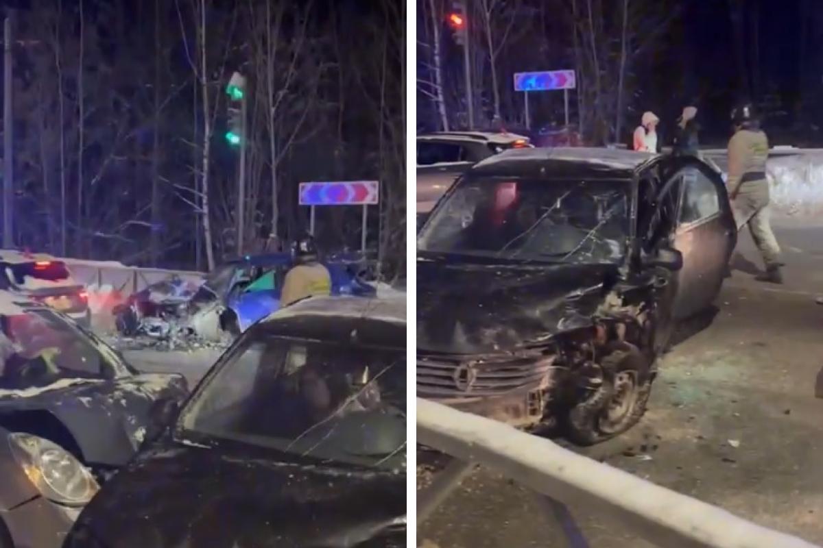 Видео с последствиями вечерней аварии очевидцы выложили в соцсетях. В кадре видно, что у трех машин сильно смяты капоты, основной удар пришелся именно туда. У искореженных автомобилей стоят медики скорой помощи.