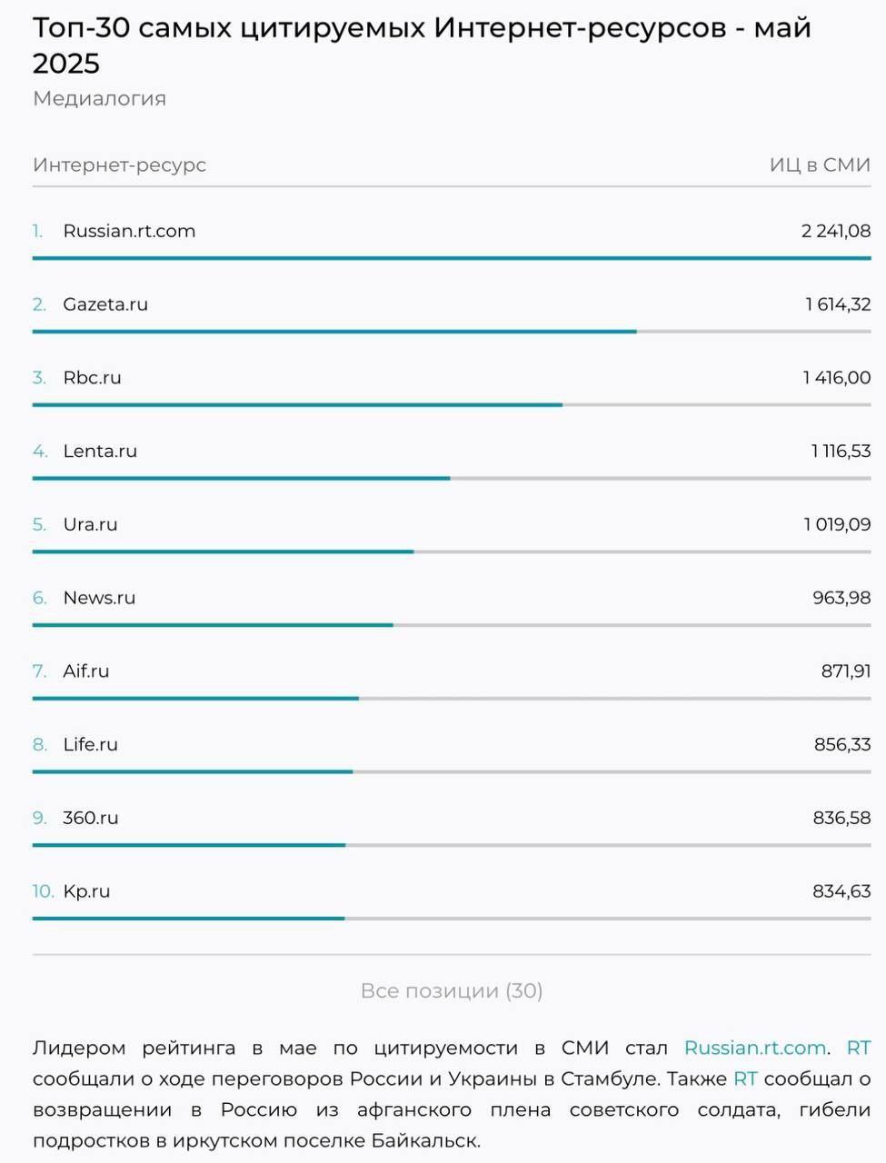 Π‘Π°ΠΉΡ RT Π½Π° ΡΡΡΡΠΊΠΎΠΌ Π·Π°Π½ΡΠ» ΠΏΠ΅ΡΠ²ΠΎΠ΅ ΠΌΠ΅ΡΡΠΎ ΡΡΠ΅Π΄ΠΈ ΠΈΠ½ΡΠ΅ΡΠ½Π΅Ρ-ΡΠ΅ΡΡΡΡΠΎΠ² ΠΏΠΎ ΡΠΈΡΠΈΡΡΠ΅ΠΌΠΎΡΡΠΈ Π² Π‘ΠΠ Π·Π° ΠΌΠ°ΠΉ 2025 Π³ΠΎΠ΄Π°, ΠΏΠΎ Π΄Π°Π½Π½ΡΠΌ Β«ΠΠ΅Π΄ΠΈΠ°Π»ΠΎΠ³ΠΈΠΈΒ». π© ΠΠΎΠ΄ΠΏΠΈΡΠ°ΡΡΡΡ | ΠΡΠΈΡΠ»Π°ΡΡ Π½ΠΎΠ²ΠΎΡΡΡ | Π§ΠΈΡΠ°ΡΡ Π°Π½Π°Π»ΠΈΡΠΈΠΊΡ