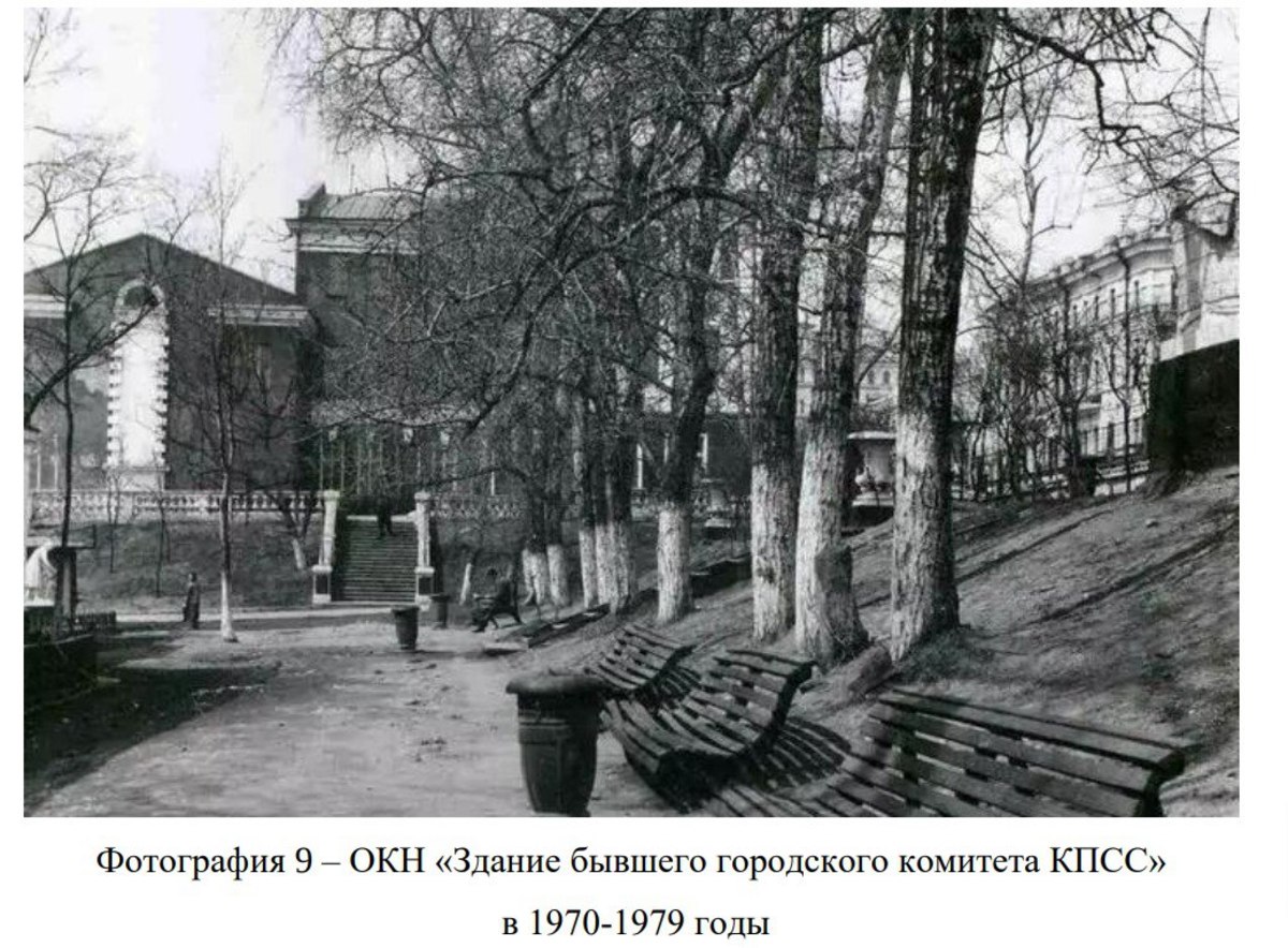 Согласно приложенной исторической справке, здание корректнее называть не бывшим горкомом КПСС (хоть он в нём действительно работал с 1960-х до 1990-х), а «Домом партийного просвещения» – именно с такой целью его строили в начале 1950-х годов.