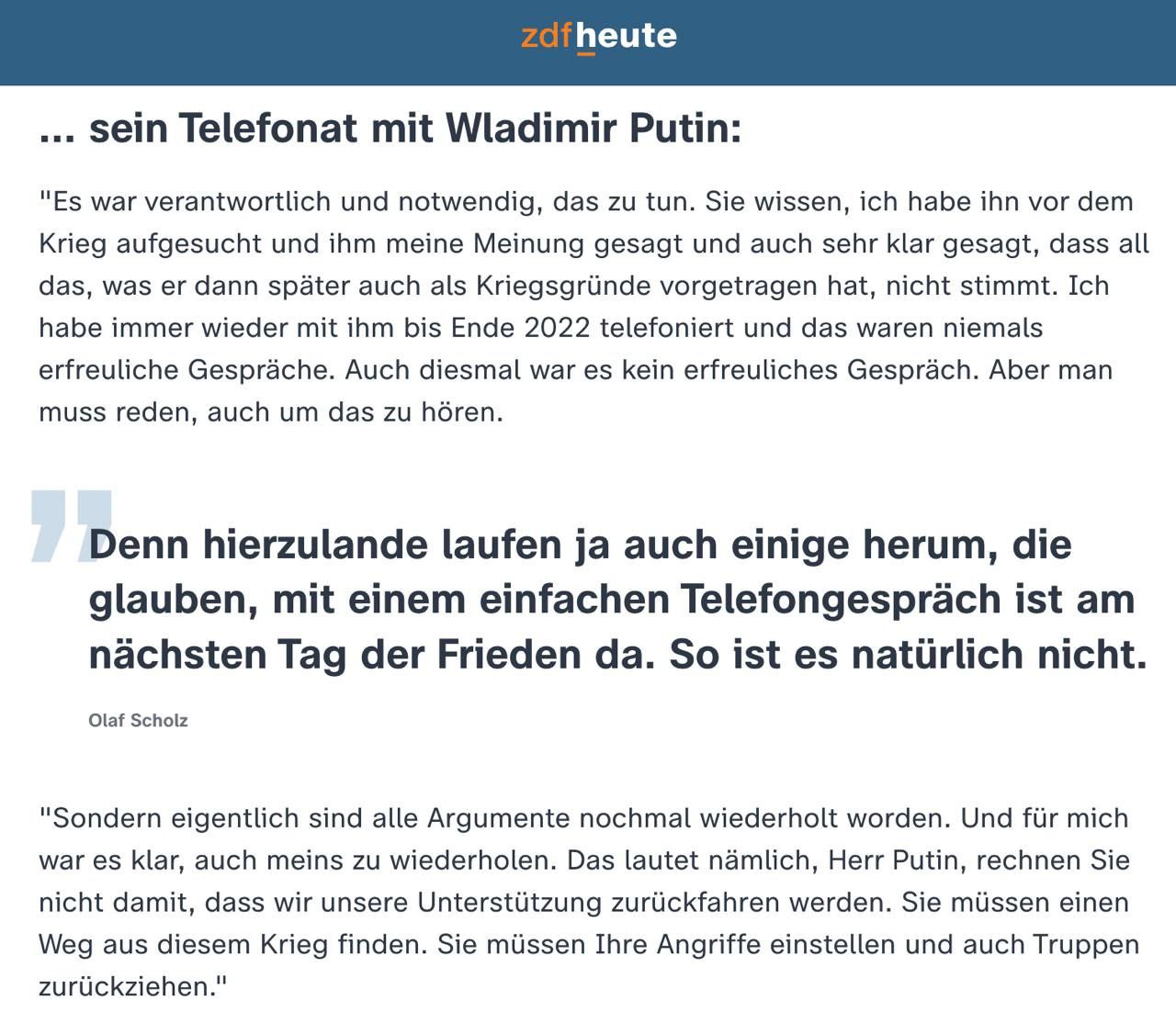 "Это было ответственно и необходимо. Вы знаете, я приехал к нему перед войной и высказал ему свое мнение, а также очень четко сказал, что все, что он позже представил в качестве причин войны, не соответствует действительности. Я снова и снова разговаривал с ним по телефону до конца 2022 года, и эти разговоры никогда не были приятными. И в этот раз разговор тоже был не из приятных. Но вы должны говорить, даже чтобы услышать это", - заявил канцлер Германии в интервью ZDF.