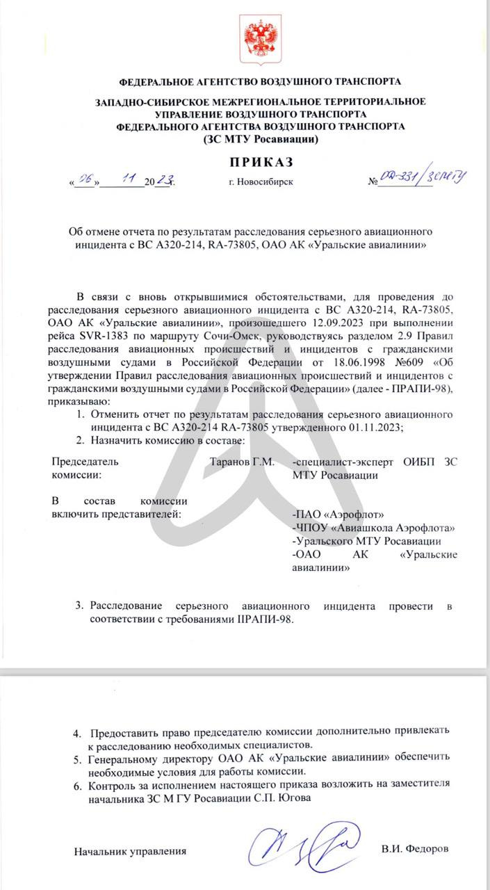 — В связи с вновь открывшимися обстоятельствами для проведения дорасследования серьезного авиационного инцидента <...> приказываю отменить отчет по результатам расследования и назначить комиссию, — говорится в приказе.