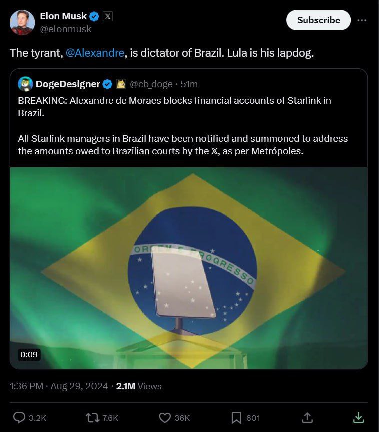 Ранее Илон Маск прокомментировал новость о том, что финансовые счета Starlink в Бразилии были заблокированы очень влиятельным в регионе судьёй Верховного суда Бразилии Алешандре де Мораесом: