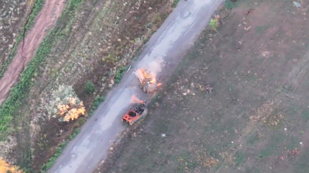 Также показаны последствия ударов - на дороге видны выгоревшие автомобили. В отдельных эпизодах дроны заходят вплотную к технике, в том числе грузовикам с установленными металлическими каркасами.