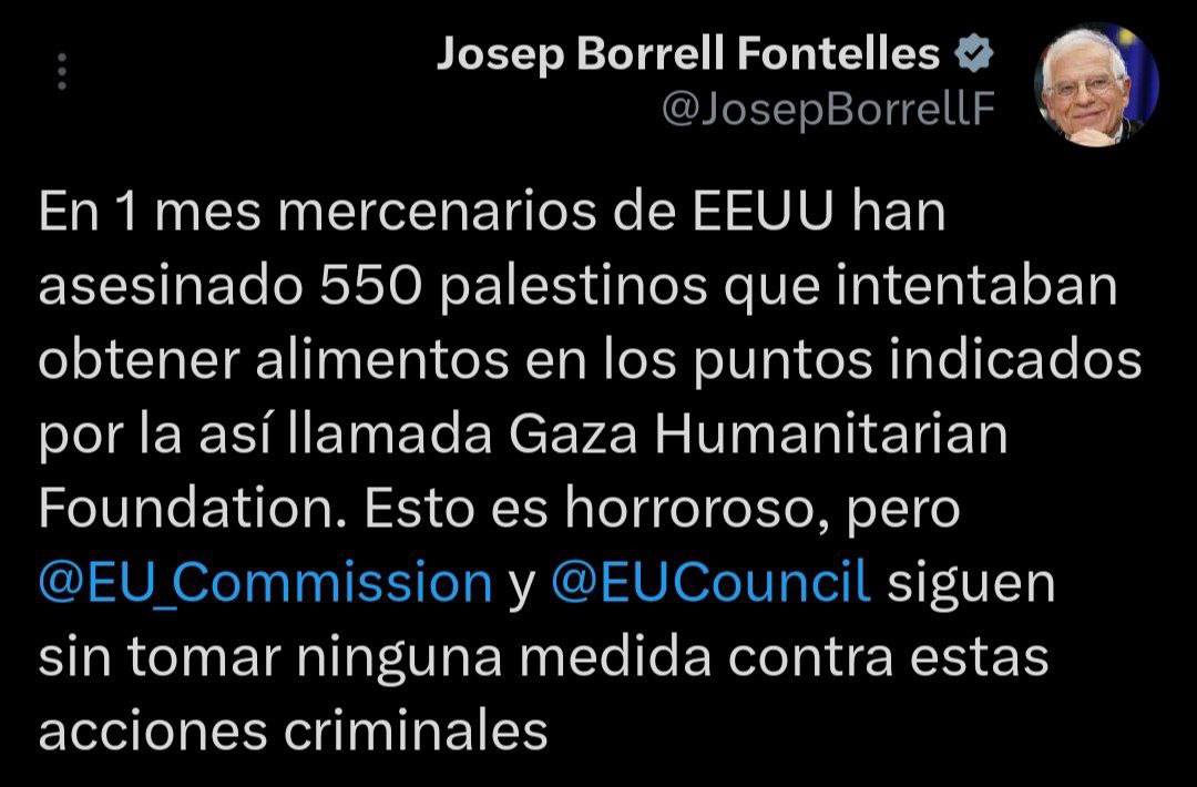 Боррель обвиняет "американских наемников", которые осуществляют программу гумпомощи в секторе Газа, в результате которой, по его данным, за месяц погибло 550 палестинцев, критикует ЕК и ЕС за бездействие.