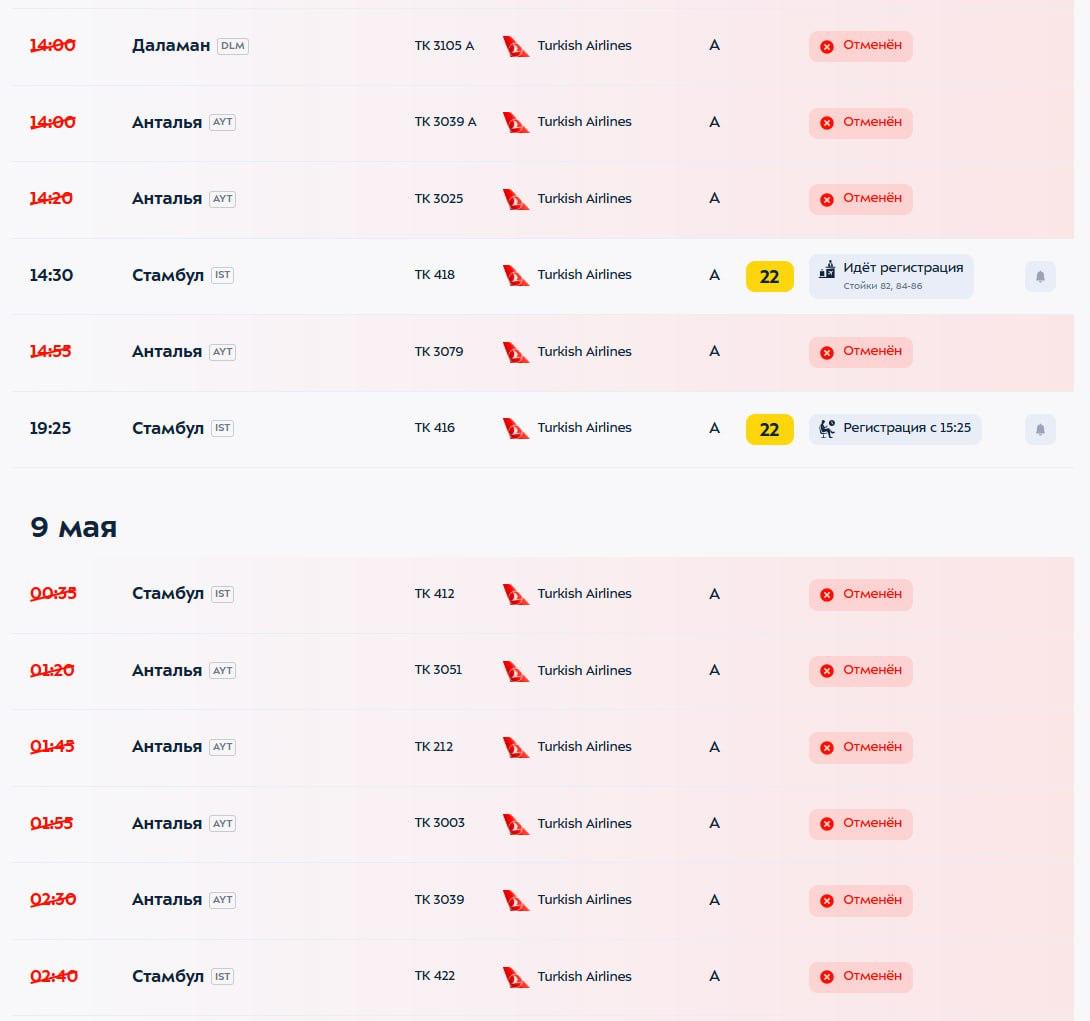 Отмена рейсов турецких авиакомпаний затронет более 15 тыс. человек, сообщили в АТОР. Turkish Airlines и Pegasus Airlines убрали из расписания 31 полёт, назначенный на 8 мая, а также восемь ночных рейсов на 9 мая. Российские туроператоры в экстренном режиме решают вопросы с туристами, уточнили в АТОР. Более 1,5 тыс. человек с отменённых рейсов в Россию размещены в гостиницах Антальи. 🟩 Подписаться | Прислать новость | Читать аналитику