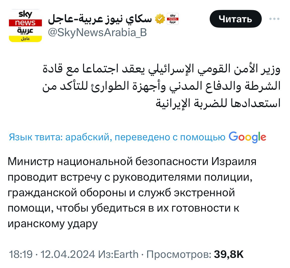 🇮🇷Министр национальной безопасности Израиля проводит встречу с руководителями полиции, гражданской обороны и служб экстренной помощи, чтобы убедиться в их готовности к иранскому удару