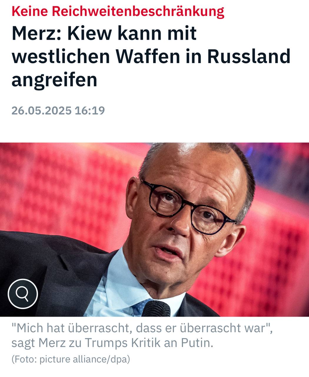 Немного о решении канцлера Мерца об отмене запрета на дальность обстрела территории России. Первое и самое интересное - Мерц дает свое согласие на те виды вооружения, которые Германия Украине не поставила. Возможно это случайный слив уже принятого решения о поставке Таурус? Да, очень вероятно. Но это может быть и вербальной атакой - мы мол принимаем решения совместно с союзниками и в том числе на грудине дального действия. Второе. Мерц заигрывает с Трампом, пытаясь доказать важность его лично и Германии в Европе. И третье. Это заявление пустое сотрясение воздуха от страха - а он панически боится войны. В любом случае, Мерц может скоро перещеголять Шольца в категории «самый худший» - #докторсосновский