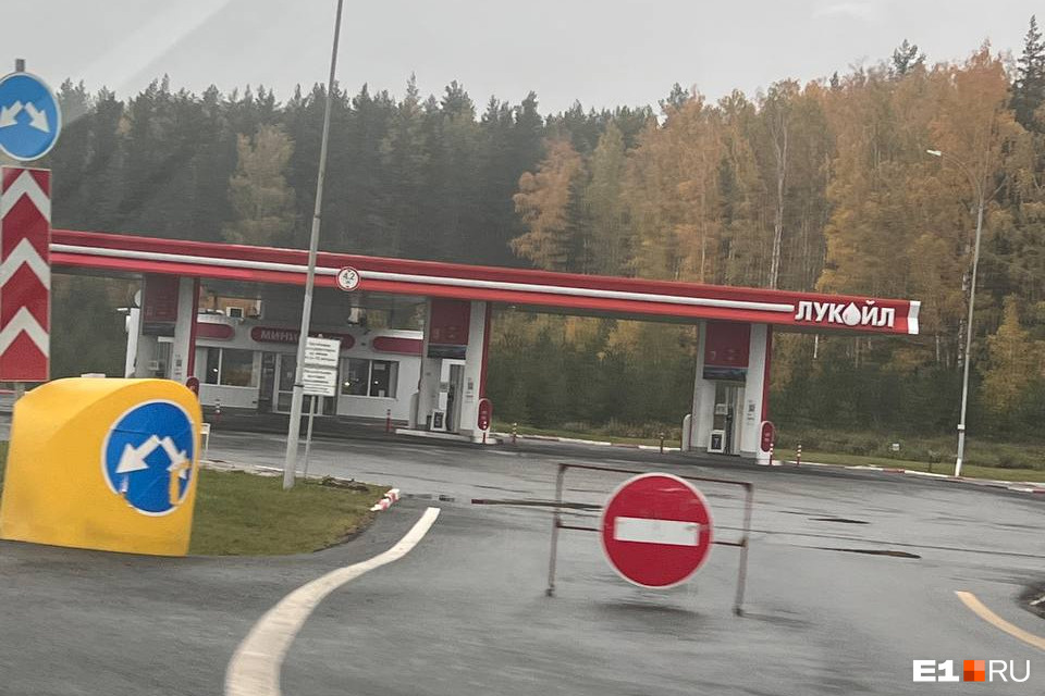Читательница E1.RU прислала фото с АЗС «Лукойл» на Челябинском тракте. Эта заправка закрыта — на въезде стоит знак «кирпич», а табло с ценами пустует.
