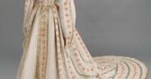Платье невесты обычно было белым (либо золотистым или цвета слоновой кости), причём если венчание было намечено на утро — платью полагалось быть закрытым и с длинными рукавами, а для вечернего венчания считалось уместным небольшое декольте и короткие рукава. Жених был одет во фрак и белый жилет. Если будущий муж был человеком военным, он венчался в парадной форме своего полка. Если венчались особенно родовитые аристократы, на церемонии мог присутствовать император. В Эрмитаже уточняют, что в приданое высокородной невесты обязательно входил ночной халат жениха и туфли из серебряной парчи, которые супруг надевал в первую брачную ночь. Невесты императорских и великокняжеских родов венчались в парадном придворном платье из серебряного глазета, расшитого серебряными нитями. Такой костюм вы увидите на выставке — платье, в котором великая княжна Ксения Александровна выходила замуж за великого князя Александра Михайловича.