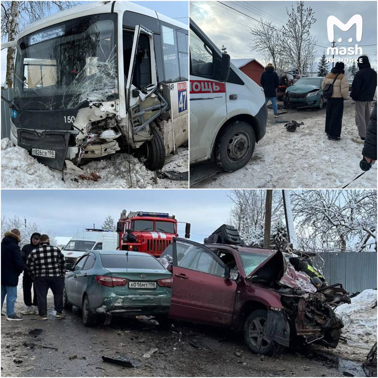Жёсткое ДТП с маршруткой у деревни Гостилицы ЛО — Suzuki столкнулся лоб в лоб с ПАЗ с пассажирами, а затем во внедорожник влетел следовавший сзади Kia Rio.
