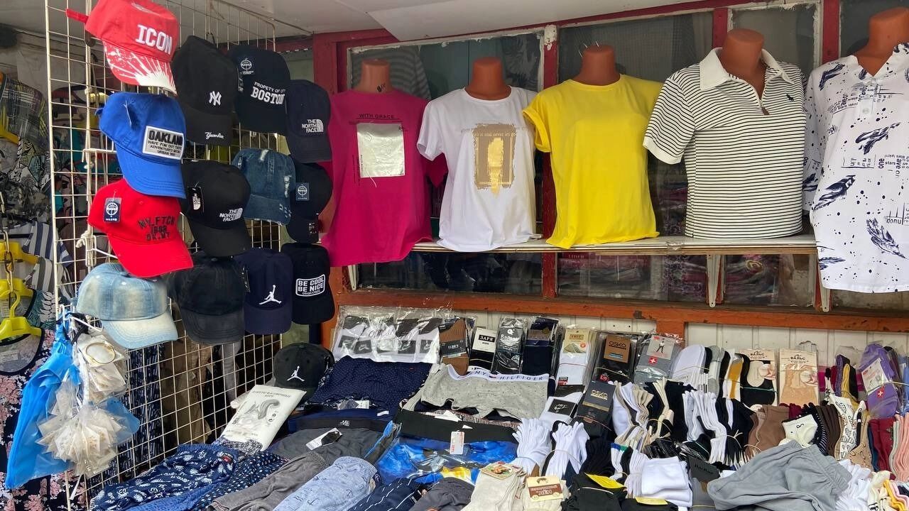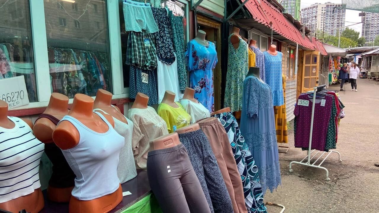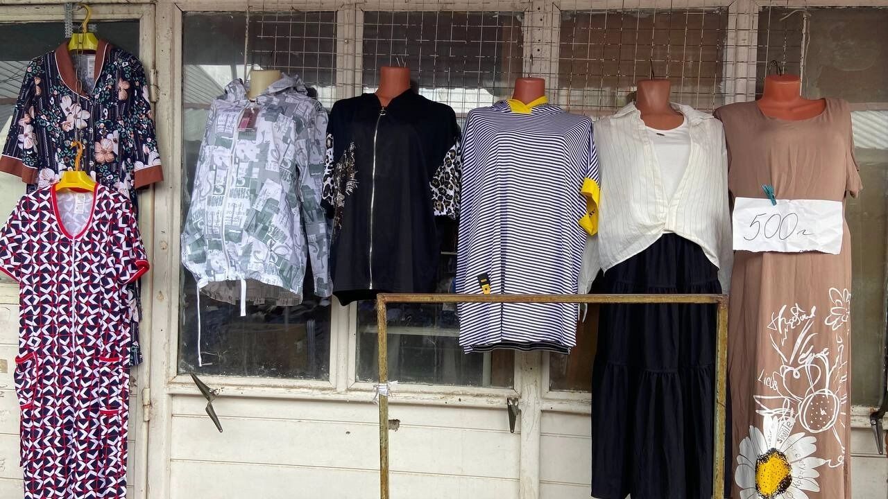 Примерочных на рынке, как и в 90-х, нет. Если нужно что-то померить — добро пожаловать за ширму на картонку. Продавцы знают своего покупателя, поэтому и ассортимент одежды рассчитан на взрослое поколение. Для модников, желающих раздать стиля, максимум что есть — это кепки и солнечные очки.