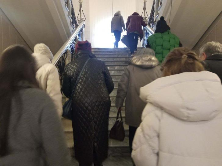 - Все, все наверх давайте, - торопят нас работники театра, чтобы не было столпотворения.Зал театра потихоньку наполняется. Прессе предлагают подняться на верхнюю ложу (3 этаж). Отсюда открывается просторный вид на всю процессию.