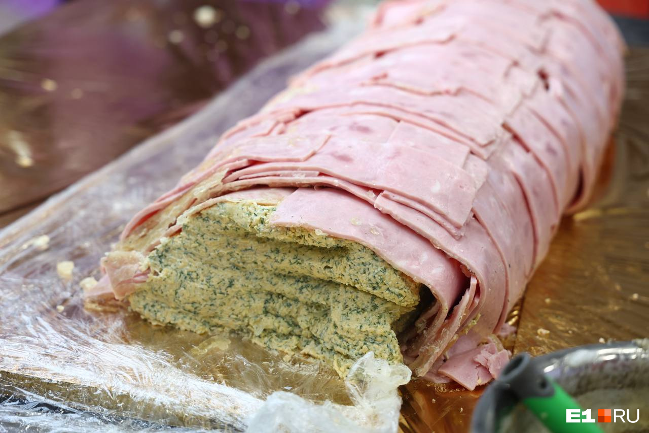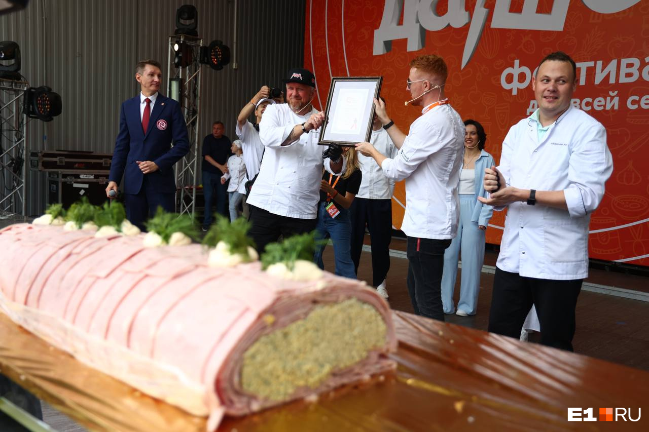 В этом деле ему помог «золотой шеф» Георгий Матвеев — победитель «Адской кухни». Готовили из ветчины, укропа, чеснока, сырной массы и майонеза. Скрепили блюдо желатином. Ожидалось, что он будет весить 30 килограммов — но в итоге получилось 41,5 килограмма!