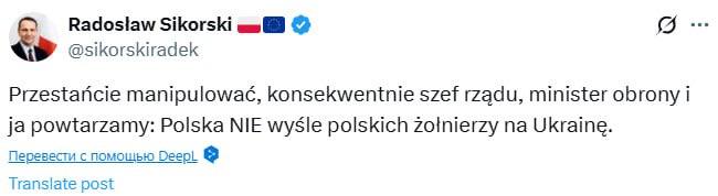 Министр иностранных дел Польши Радослав Сикорский заявил, что Варшава не рассматривает возможность отправки польских войск в Украину.