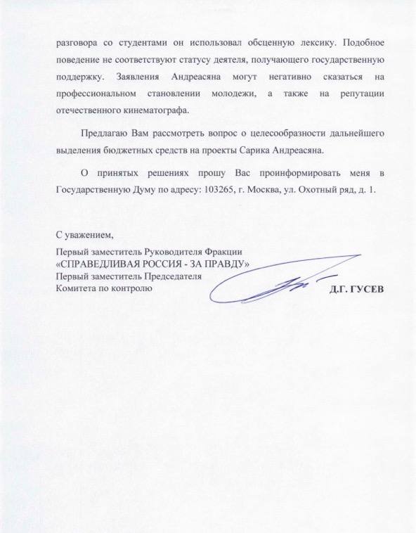 «За последние 10 лет на проекты режиссера Сарика Андреасяна из бюджета выделено 590 миллионов рублей… Однако результаты проката его фильмов свидетельствуют о низкой востребованности данных работ среди зрителей», — написал в письме к министру Гусев.