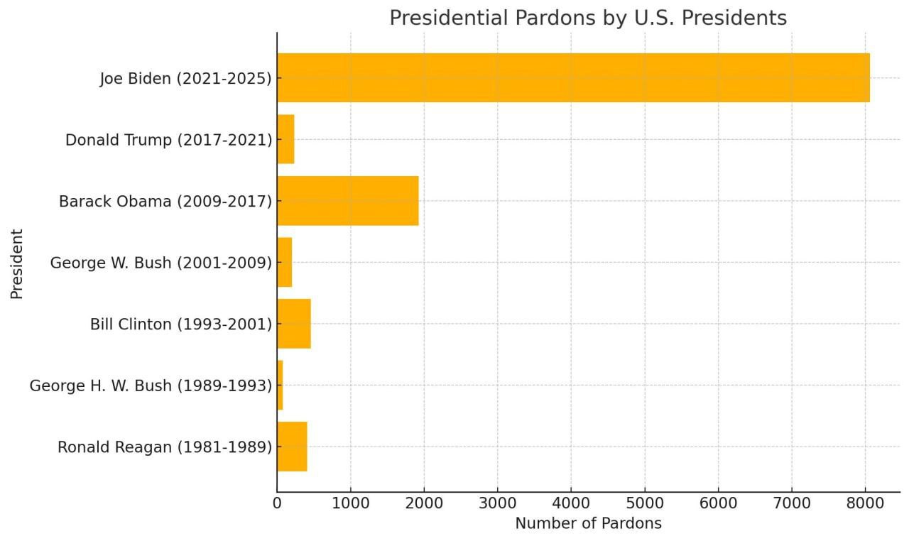 При этом Трамп одним указом в свой первый день в Белом доме помиловал уже 1500 человек и имеет все шансы обойти по количеству помилований Байдена к концу своего срока.