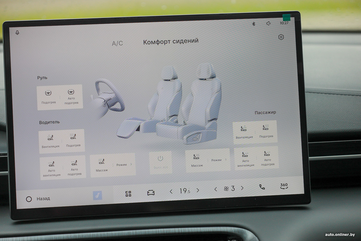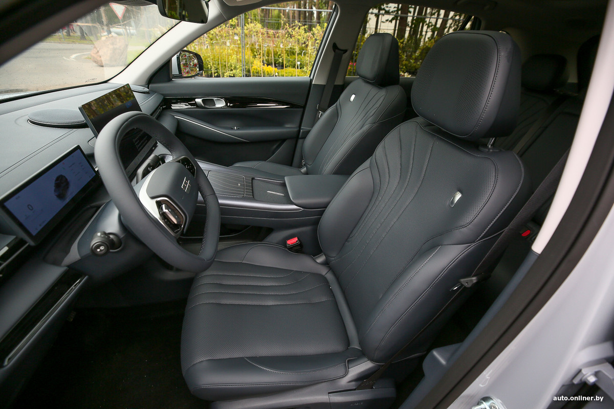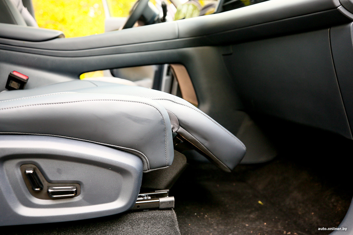 Передние кресла выглядят солидно и помимо подогрева могут похвастать не только вентиляцией, но и массажем с несколькими режимами работы. Пассажирское кресло к тому же имеет оттоманку. Эх, водительскому бы еще добавить регулируемую длину подушки, как у Atlas, но обошлось без нее. Угол подушки слегка меняется в ходе настройки по высоте, однако подобрать оптимальную посадку в целом просто, тем более что рулевая колонка двигается и по высоте, и по вылету, причем в широких диапазонах.