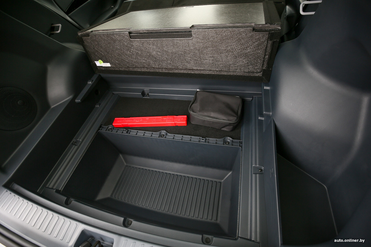 Багажник радует отсутствием ступеньки по проему, но его вид сначала вызывает недоумение: здесь точно 461 литр? Но, во-первых, «пол» можно установить ниже, что дает добрую сотню литров, а во-вторых, ниже скрывается дополнительный емкий отсек. Однако запаски, разумеется, нет, спинка дивана складывается вровень с полом лишь в его верхнем положении, а отделка боковин из жесткого пластика не очень практична. Да, и полки багажника в автомобиле не оказалось, хотя направляющие для нее есть.