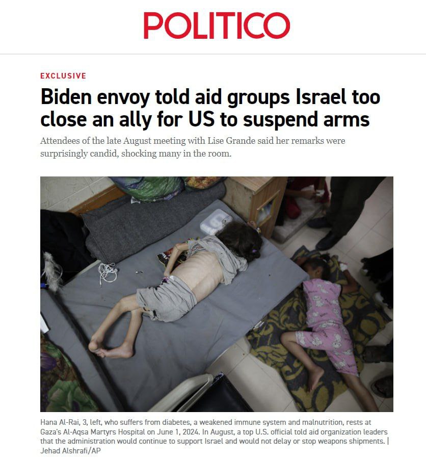 ΠΠ·Π΄Π°Π½ΠΈΠ΅ Politico ΡΠΎΠΎΠ±ΡΠ°Π΅Ρ, ΡΡΠΎ Π½Π° Π²ΡΡΡΠ΅ΡΠ΅ Π² ΠΊΠΎΠ½ΡΠ΅ Π°Π²Π³ΡΡΡΠ° ΠΠΈΠ· ΠΡΠ°Π½Π΄Π΅, ΡΠΏΠ΅ΡΠΏΡΠ΅Π΄ΡΡΠ°Π²ΠΈΡΠ΅Π»Ρ ΠΏΡΠ΅Π·ΠΈΠ΄Π΅Π½ΡΠ° ΠΠ°ΠΉΠ΄Π΅Π½Π° ΠΏΠΎ Π³ΡΠΌΠ°Π½ΠΈΡΠ°ΡΠ½ΡΠΌ Π²ΠΎΠΏΡΠΎΡΠ°ΠΌ Π½Π° ΠΠ»ΠΈΠΆΠ½Π΅ΠΌ ΠΠΎΡΡΠΎΠΊΠ΅, ΡΠΎΠΎΠ±ΡΠΈΠ»Π° ΡΡΠΊΠΎΠ²ΠΎΠ΄ΠΈΡΠ΅Π»ΡΠΌ ΠΌΠ΅ΠΆΠ΄ΡΠ½Π°ΡΠΎΠ΄Π½ΡΡ Π³ΡΠΌΠ°Π½ΠΈΡΠ°ΡΠ½ΡΡ ΠΎΡΠ³Π°Π½ΠΈΠ·Π°ΡΠΈΠΉ, ΡΡΠΎ Π°Π΄ΠΌΠΈΠ½ΠΈΡΡΡΠ°ΡΠΈΡ Π‘Π¨Π ΠΏΡΠΎΠ΄ΠΎΠ»ΠΆΠΈΡ ΠΏΠΎΠ΄Π΄Π΅ΡΠΆΠΈΠ²Π°ΡΡ ΠΠ·ΡΠ°ΠΈΠ»Ρ, Π΄Π°ΠΆΠ΅ Π΅ΡΠ»ΠΈ ΠΎΠ½Π° Π·Π°Π±Π»ΠΎΠΊΠΈΡΡΠ΅Ρ ΠΏΠΎΡΡΠ°Π²ΠΊΠΈ Π² ΠΠ°Π·Ρ ΠΎΡΠ½ΠΎΠ²Π½ΡΡ Π³ΡΠΌΠ°Π½ΠΈΡΠ°ΡΠ½ΡΡ Π³ΡΡΠ·ΠΎΠ², ΡΠ°ΠΊΠΈΡ ΠΊΠ°ΠΊ ΠΏΡΠΎΠ΄ΠΎΠ²ΠΎΠ»ΡΡΡΠ²ΠΈΠ΅ ΠΈ Π»Π΅ΠΊΠ°ΡΡΡΠ²Π°.