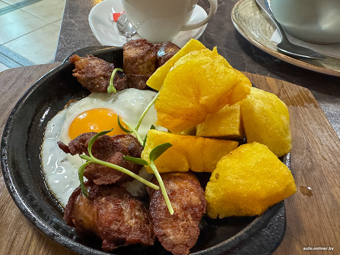 Интерьер довольно современный, хотя есть вопросы к некоторым его элементам. Но давайте лучше о еде. В салате не хватило заправки (хотя бы масла), борщ «типично столовский», хотя пампушки были горячие и свежие. Рыба доставила ровно ноль эмоций, вкусной назвать ее не можем. Яичницу и колбаски слегка пережарили, хотя это, конечно, на любителя. Картошка в двух блюдах показалась какой-то суховатой.