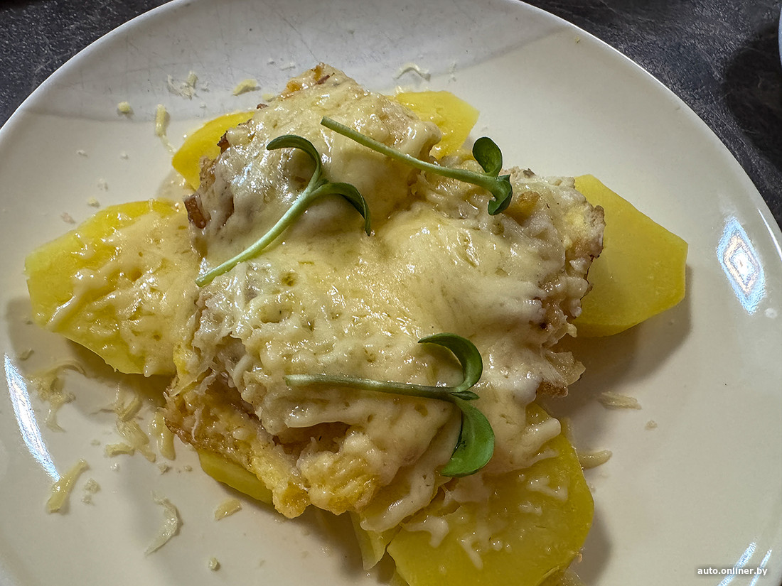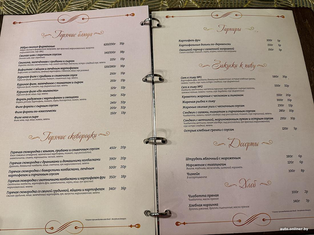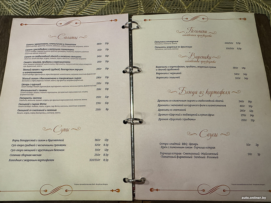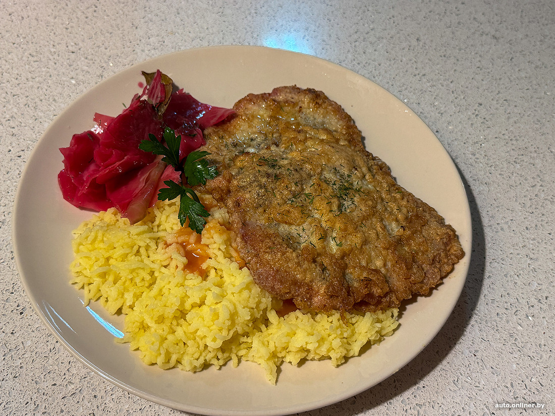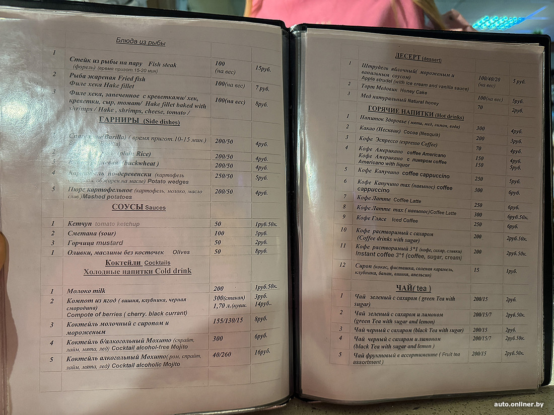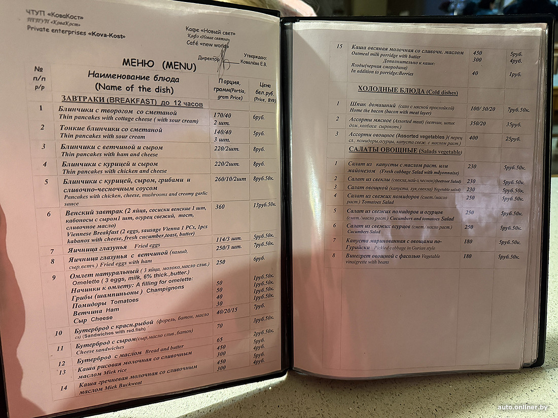 В общем, повара в «Новом свете» на своем месте и явно любят свою работу. То ли неожиданный контраст между интерьером и вкусной едой сыграл свою роль, то ли мы проголодались… Но будем проезжать мимо — заедем попробовать и другие позиции в меню. Ужин был очень плотным, на двоих потратили 69,75 рубля. Почти как в минском ресторане.