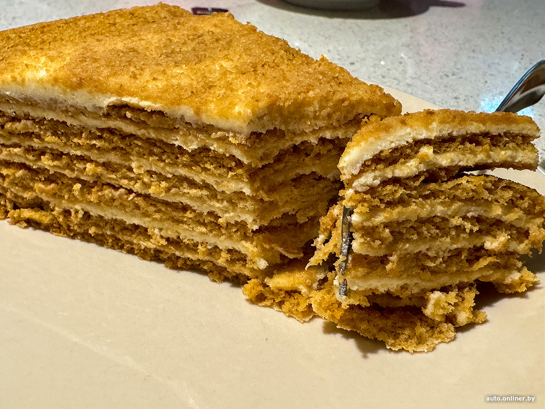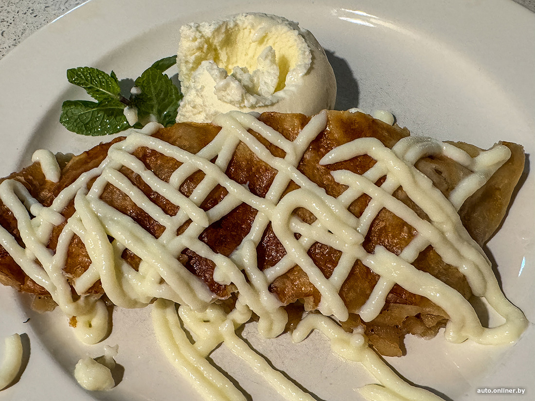 Отдельный комплимент — десертам. Штрудель подали горячим, переполненным начинкой, с шариком мороженого. Медовик (еще раз подчеркнем, что его готовят местные повара) — не сухой и не приторно сладкий.