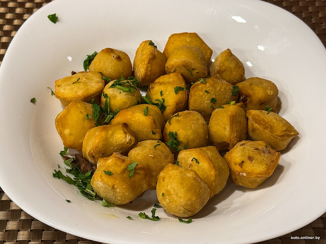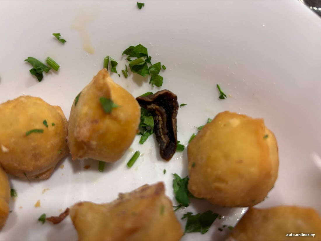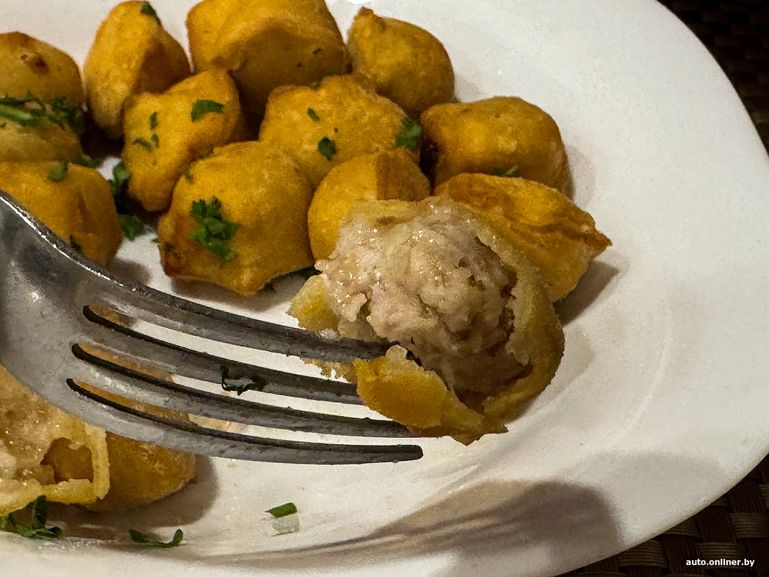Тем не менее мы польстились на пельмени и вареники собственного производства. Остановились на тех, что со свининой и зажарены во фритюре. Сразу скажем, что сами по себе пельмени показались слегка безвкусными, но сметана и томатный соус ситуацию исправили. Каким-то образом в тарелке оказался кусок жареного гриба: предположим, что кто-то плохо вымыл фритюрницу.