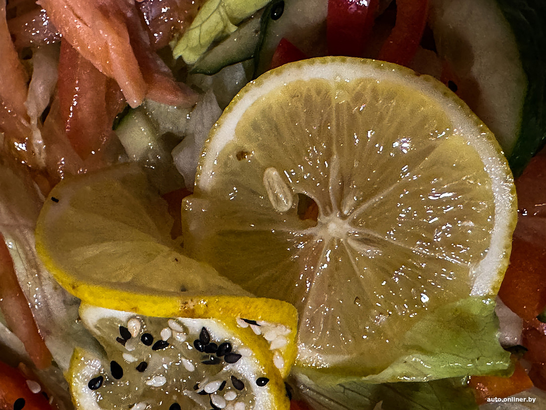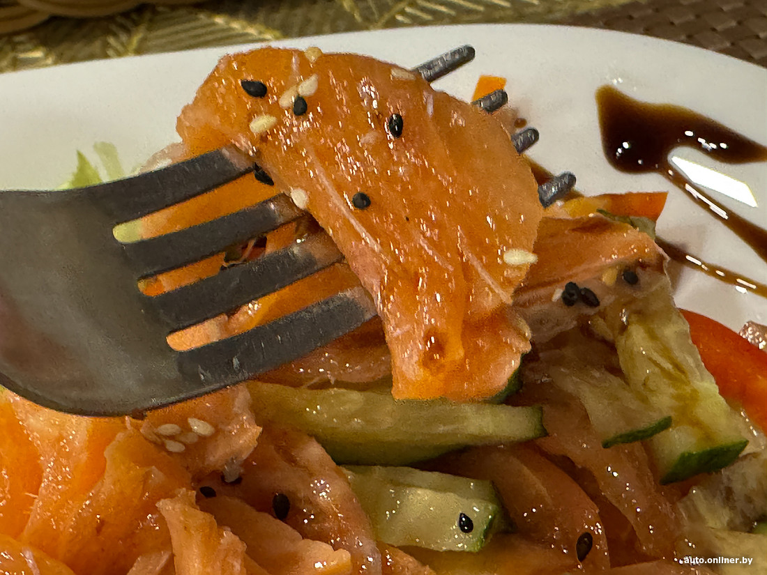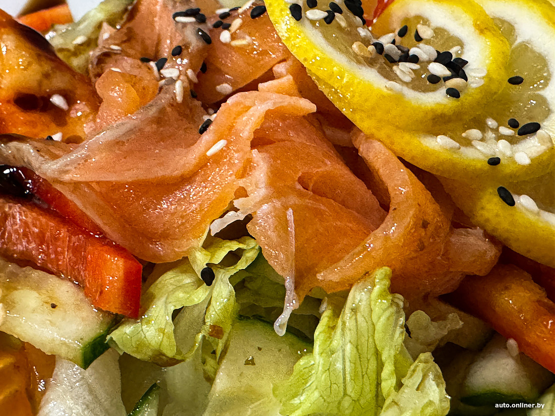 Салат со слабосоленой семгой тоже не сильно порадовал. Все из-за рыбы: во-первых, она была с косточками, а во-вторых, судя по виду, подверглась термической обработке, отчего стала чересчур соленой.