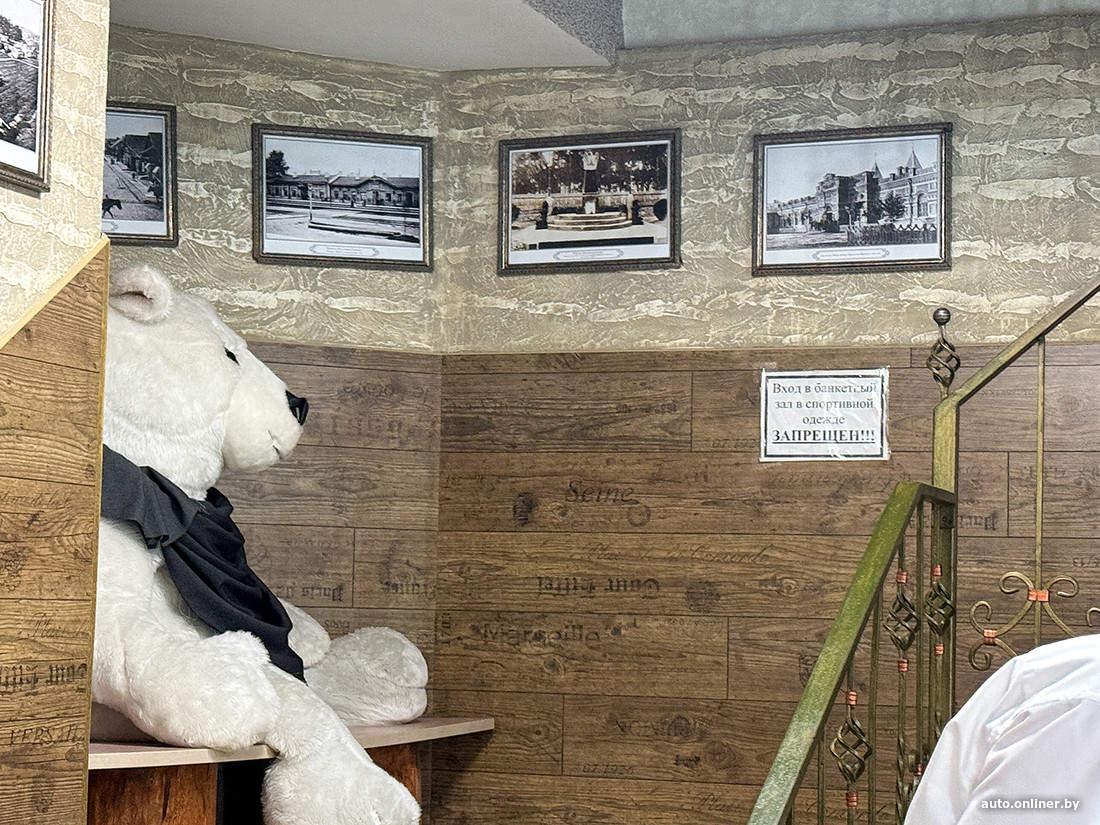 Следующее заведение носит длинное название «Корчма Замок Зубра». Оно относится к комплексу, где также располагаются отель, зал для бильярда, хамам и другие радости жизни. На парковке мы решили почистить дверные карты и подстаканники от «командировочного» мусора, и в этот момент к нам подошел охранник заведения.