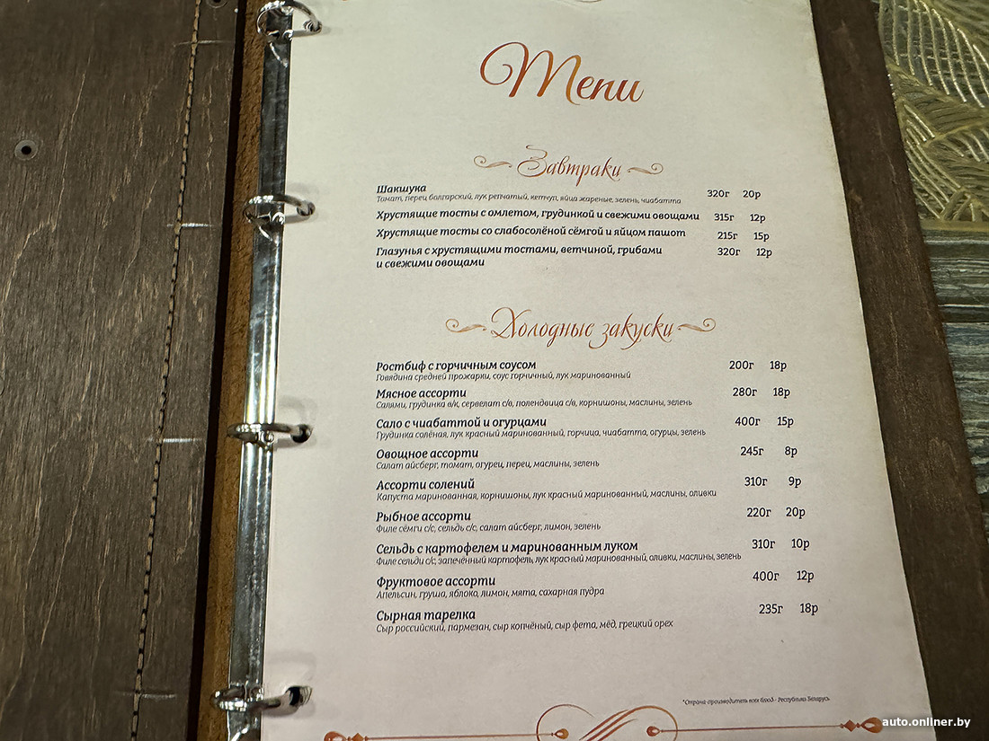 К слову, о персонале. Обслуживание в «Карлионе» порадовало больше, чем в других заведениях. Молодому официанту было не совсем безразлично, уйдем мы довольными или нет, общался он вежливо. Спокойно отреагировал на просьбу убрать некоторые ингредиенты из блюда и, главное, не забыл о ней. Кстати, вход в банкетный зал в спортивной одежде — под строжайшим запретом, о чем говорит надпись на стене. Такой вот дресс-код, а что вы хотели — все-таки на одной из важнейших транзитных трасс страны находимся.