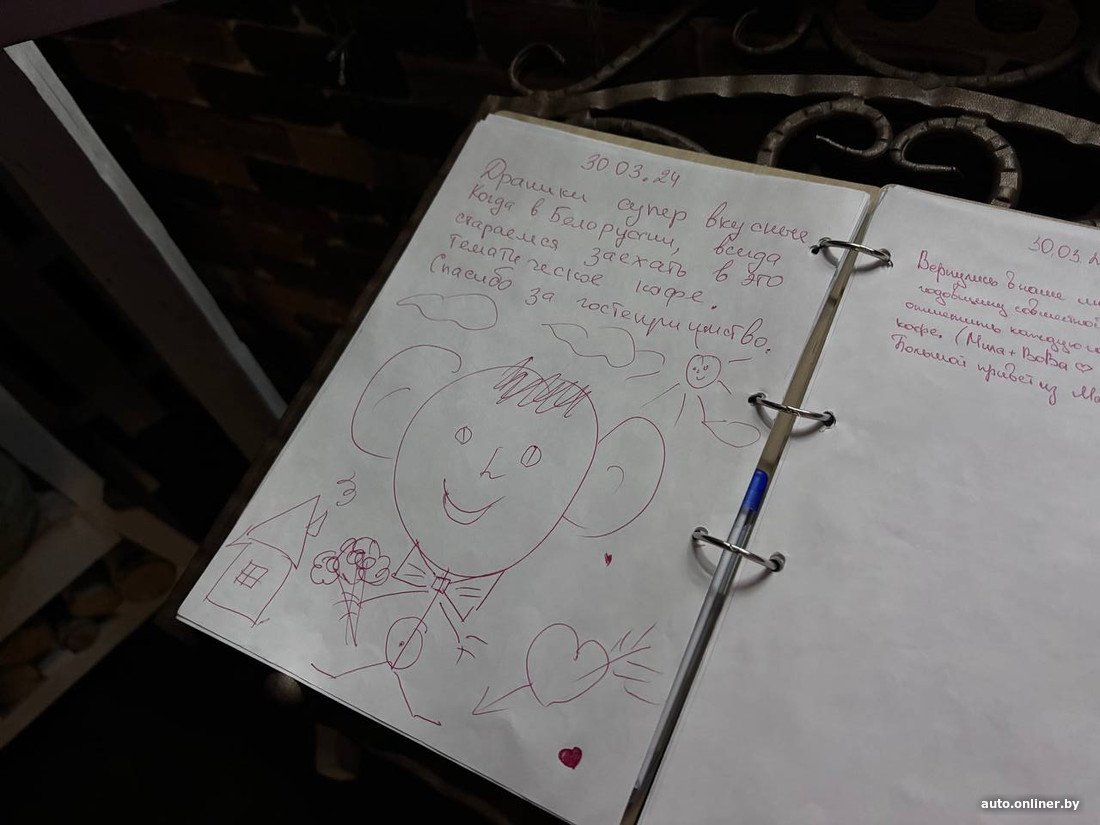 От такого позитивного начала даже разыгрался аппетит. По пути в зал мы отметили фотографии (предположительно) коллектива комплекса с юмористическими надписями. А еще кто-то оставил «наскальную живопись» в книге жалоб и предложений.