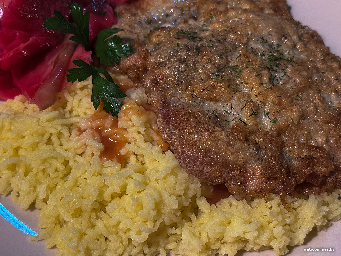 Большая порция шницеля, посыпанного зеленью, и пюре тоже заслуживает только комплиментов. Было вкусно, не пресно, много. Суп — наваристый и ароматный.