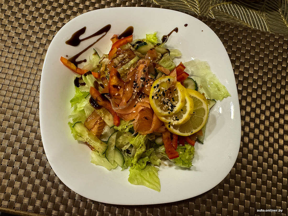 Начнем с салата: он поразил оригинальностью кулинарной мысли. Кальмары, креветки, грибы, цукини, вкусный соус (так и не определили, что за он)… Все это на удивление очень неплохо сочеталось между собой.