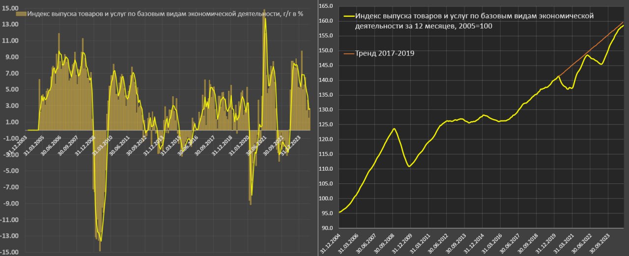 Индекс выпуска товаров и услуг по базовым видам экономической деятельности в России вырос на 3% г/г, за 9м24 рост на 4.9% г/г, а в сравнении с 9м21 рост на 9.7%.