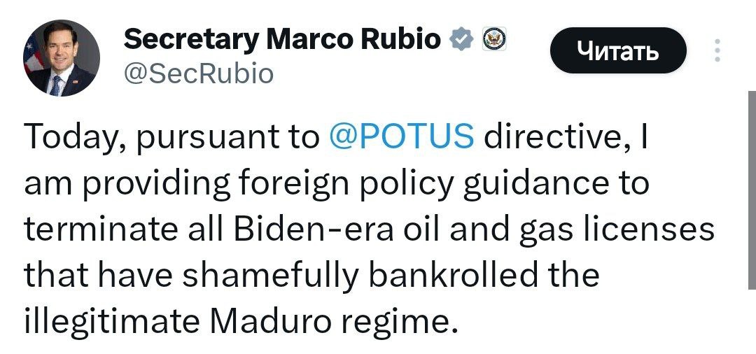 «Сегодня, в соответствии с директивой президента, я даю внешнеполитические указания по аннулированию всех нефтяных и газовых лицензий эпохи Байдена, которые позорно финансировали незаконный режим Мадуро».