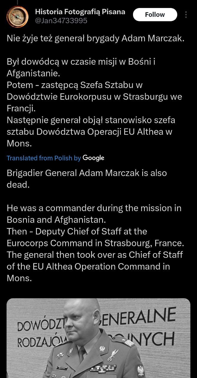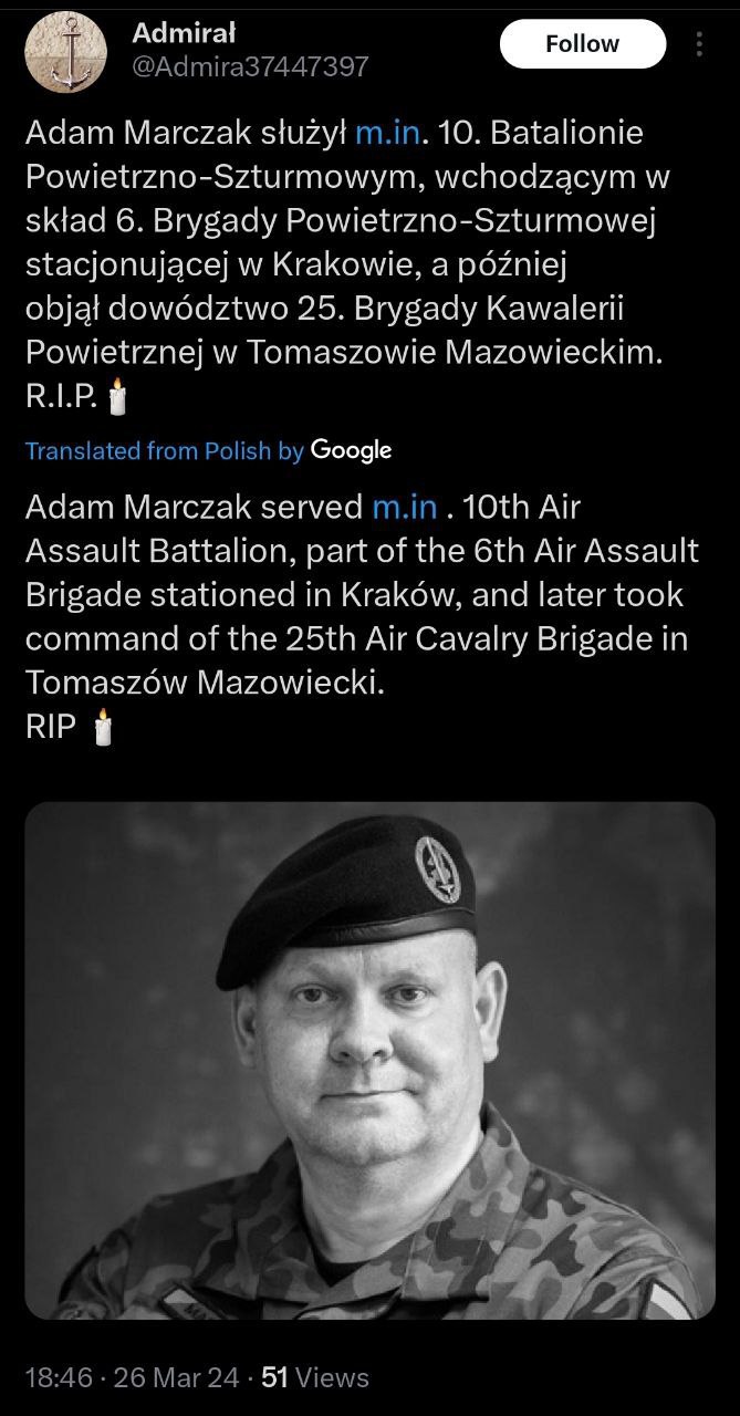 Ресурс https://t.me/DDGeopolitics сообщает, что в районе Часов Яра российские войска уничтожили польского бригадного генерала Адама Марчака, который ранее командовал польскими оккупационными силами в Афганистане, а также в Боснии. Как пишут, командный пункт был поражен ракетой ОТРК "Искандер".