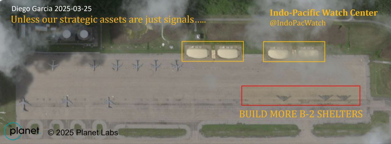Три стратегических бомбардировщика B-2A Spirit, 7 самолётов - заправщиков KC-135 Stratotanker, один военно-транспортный Boeing C-17A Globemaster III и противолодочный самолёт P-8A Poseidon на авиабазе Диего-Гарсия в Индийском океане.