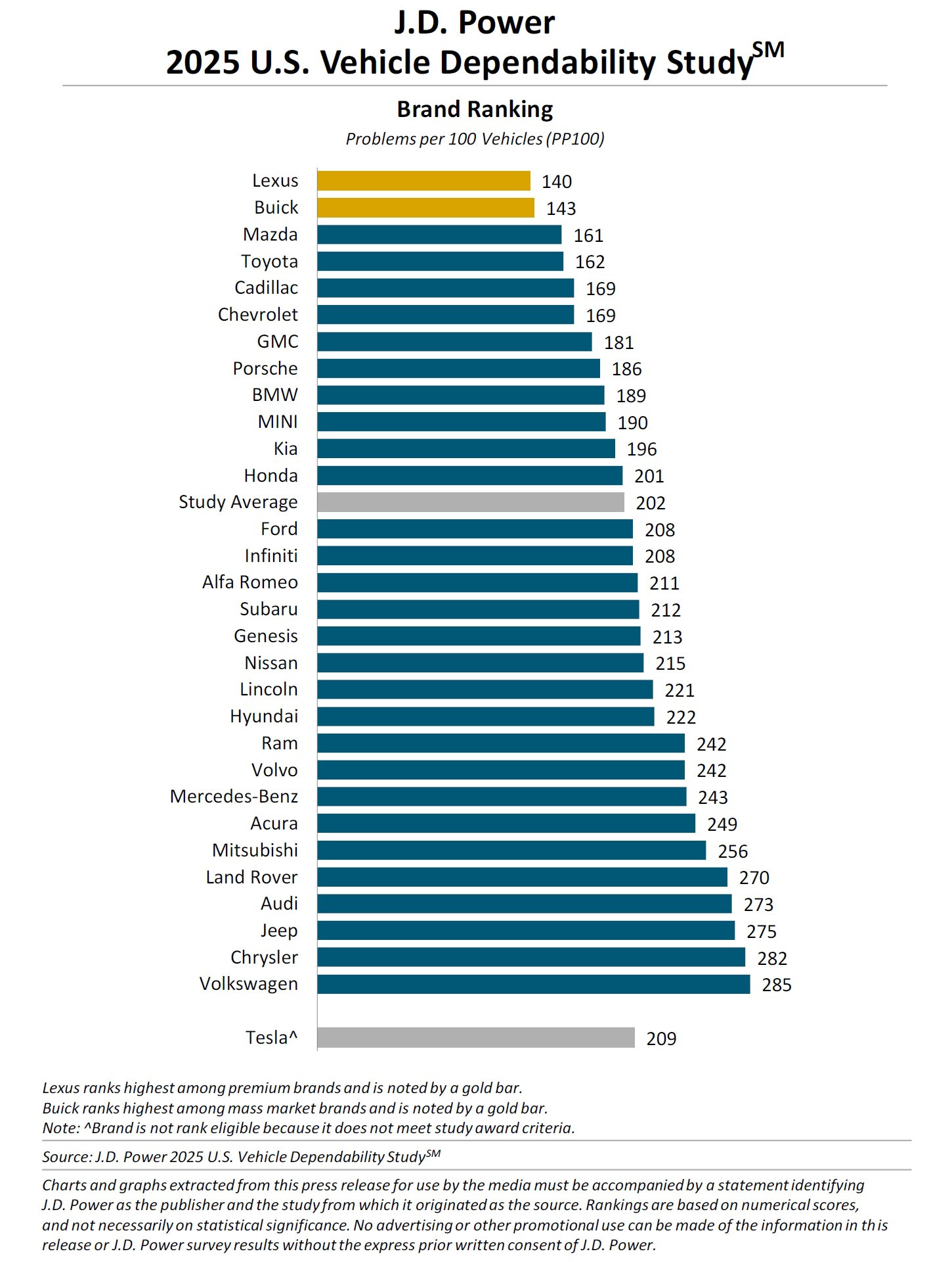 Рейтинг надёжности J.D. Power 2025: Lexus опять лучший, VW скатился на последнее место