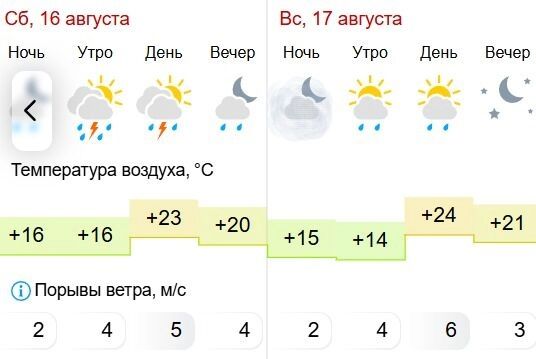В ночь на воскресенье столбик термометра упадет до +15, ожидается туман. Днем потеплеет до +24 градусов, вечером температура воздуха составит около +21. 17 августа небольшой дождь прогнозируется утром и днем.